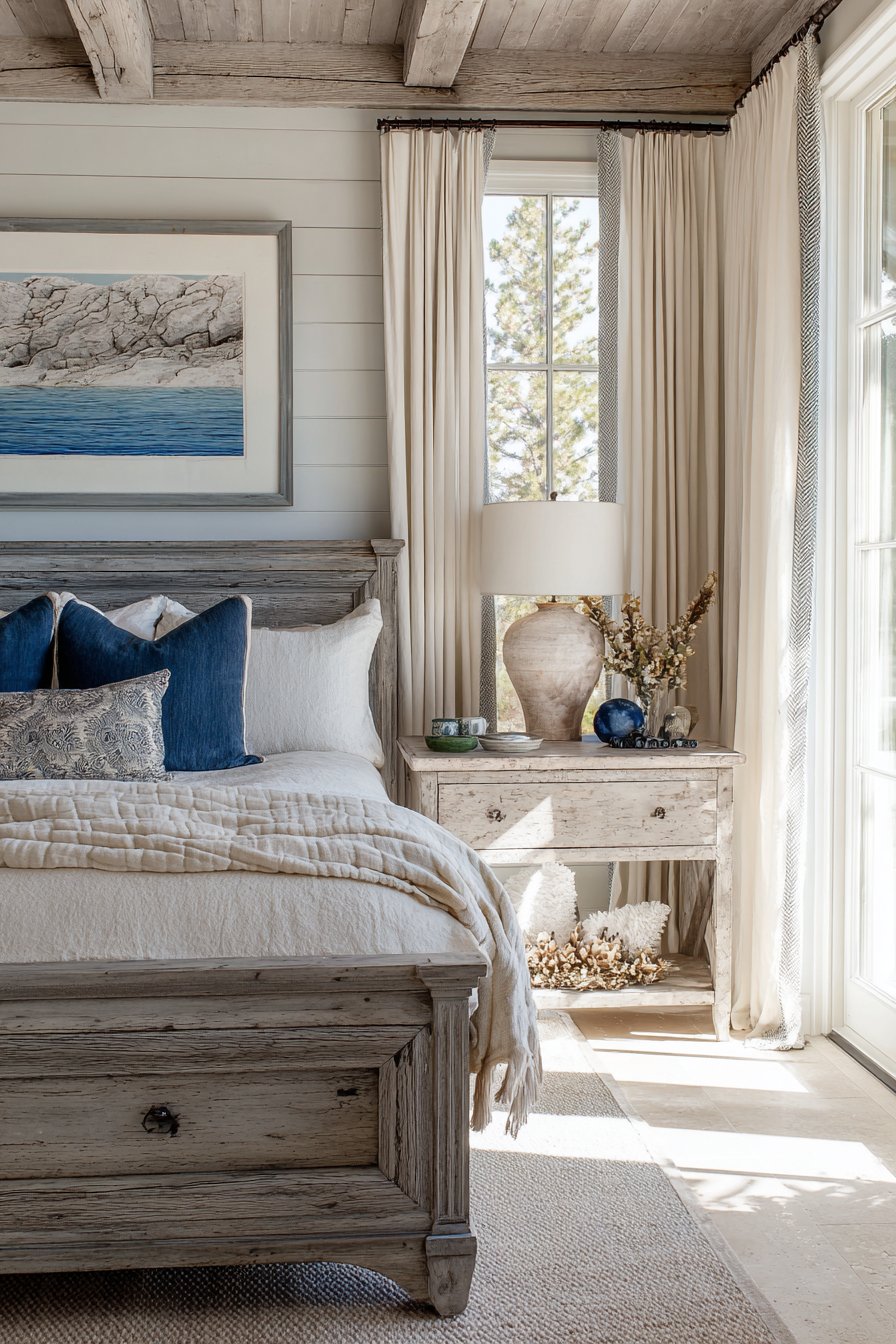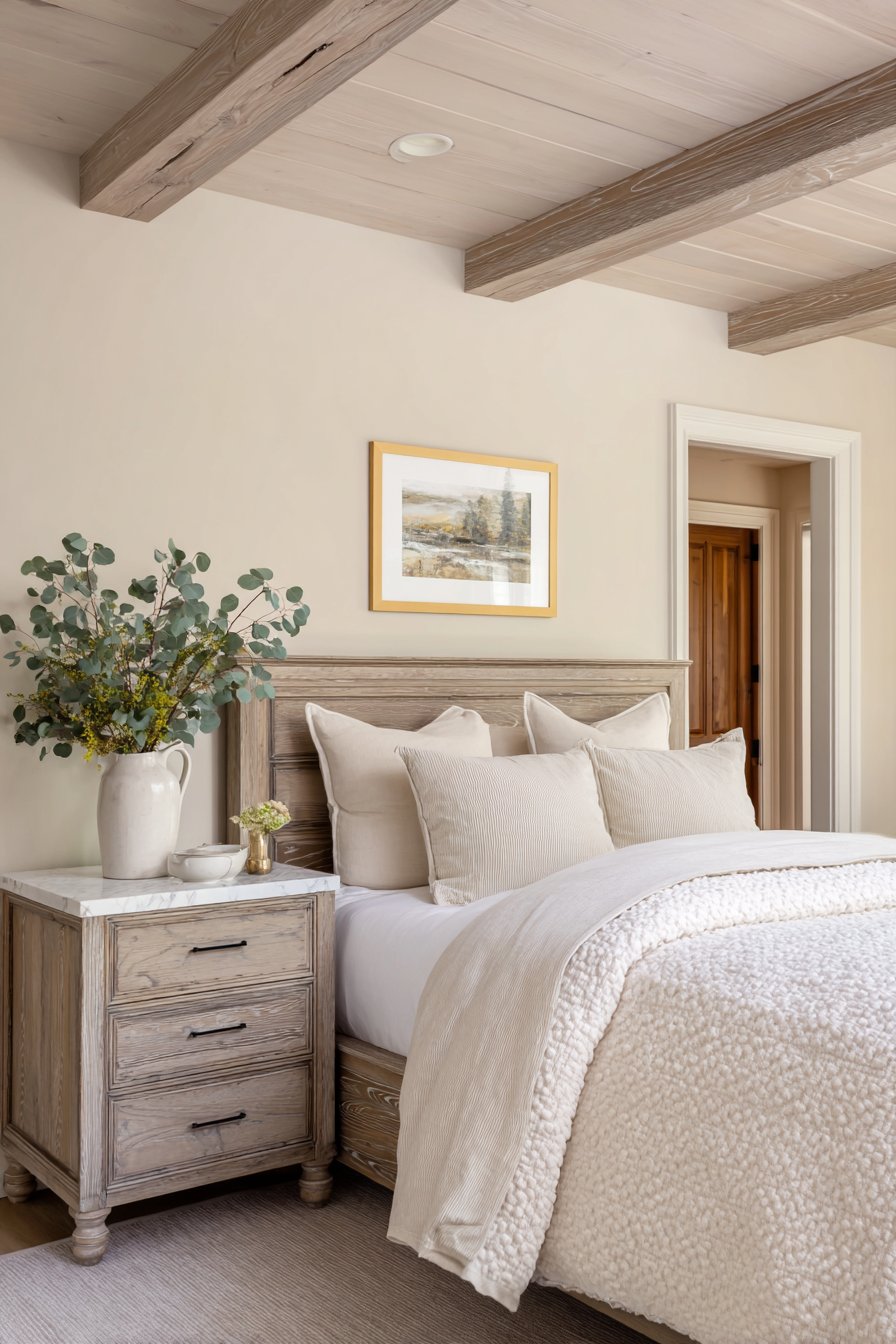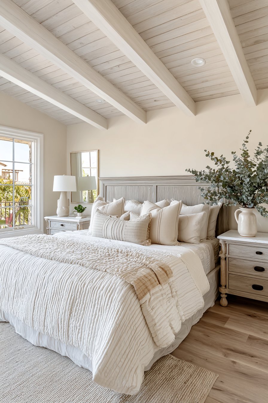 Exposed ceiling beams painted soft gray create architectural drama. These contrast beautifully with cream tongue-and-groove ceiling planks. The structural elements add character overhead. A gray-washed wooden headboard features planked construction. Visible wood grain texture adds organic beauty. Cream matelassé coverlet provides textured sophistication.