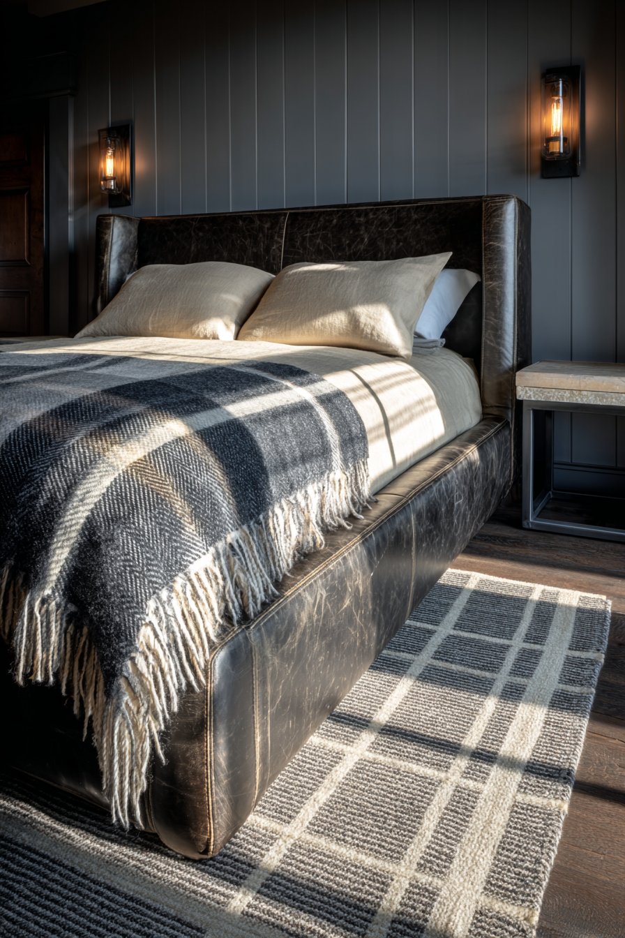 A leather headboard in charcoal gray creates masculine sophistication. Visible grain texture and natural wear patterns add character. Cream cotton sheets provide crisp comfort. Gray flannel duvet cover adds warmth and texture. A gray wool throw features cream contrast stitching.