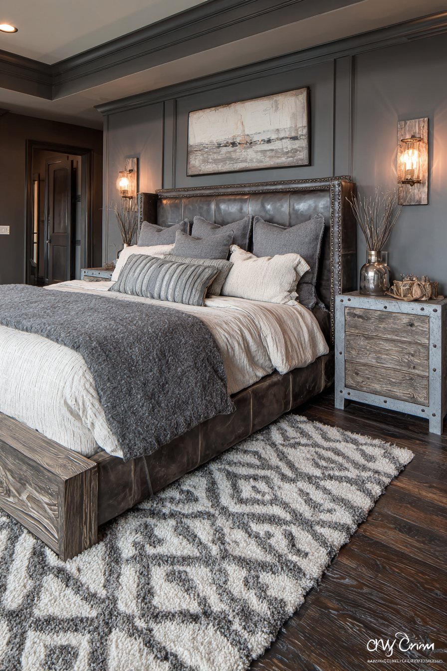 Industrial-style nightstands combine gray metal frames with cream travertine tops. The substantial storage feels practical and handsome. Deep warm gray walls create cozy atmosphere. Cream wainscoting below adds architectural interest. A substantial gray wool area rug features cream geometric patterns.