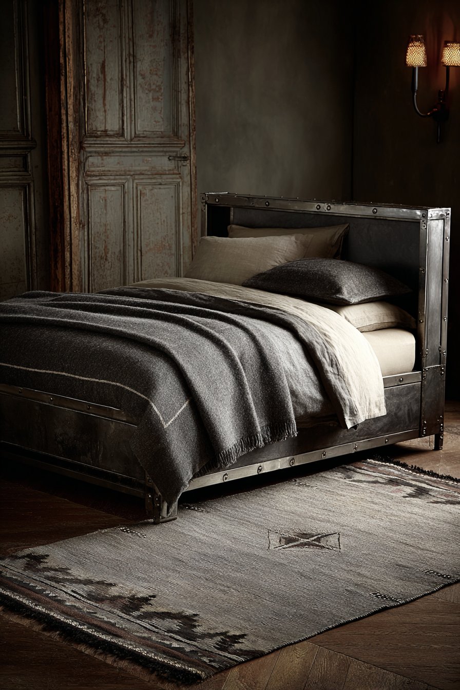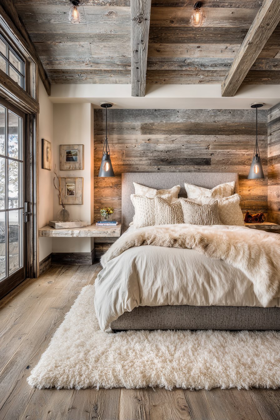 A cream shag rug adds softness beneath the bed. Natural directional lighting emphasizes textural contrasts. Material authenticity shines in every element. The sophisticated rustic aesthetic feels both current and timeless. Modern and rustic elements balance perfectly.