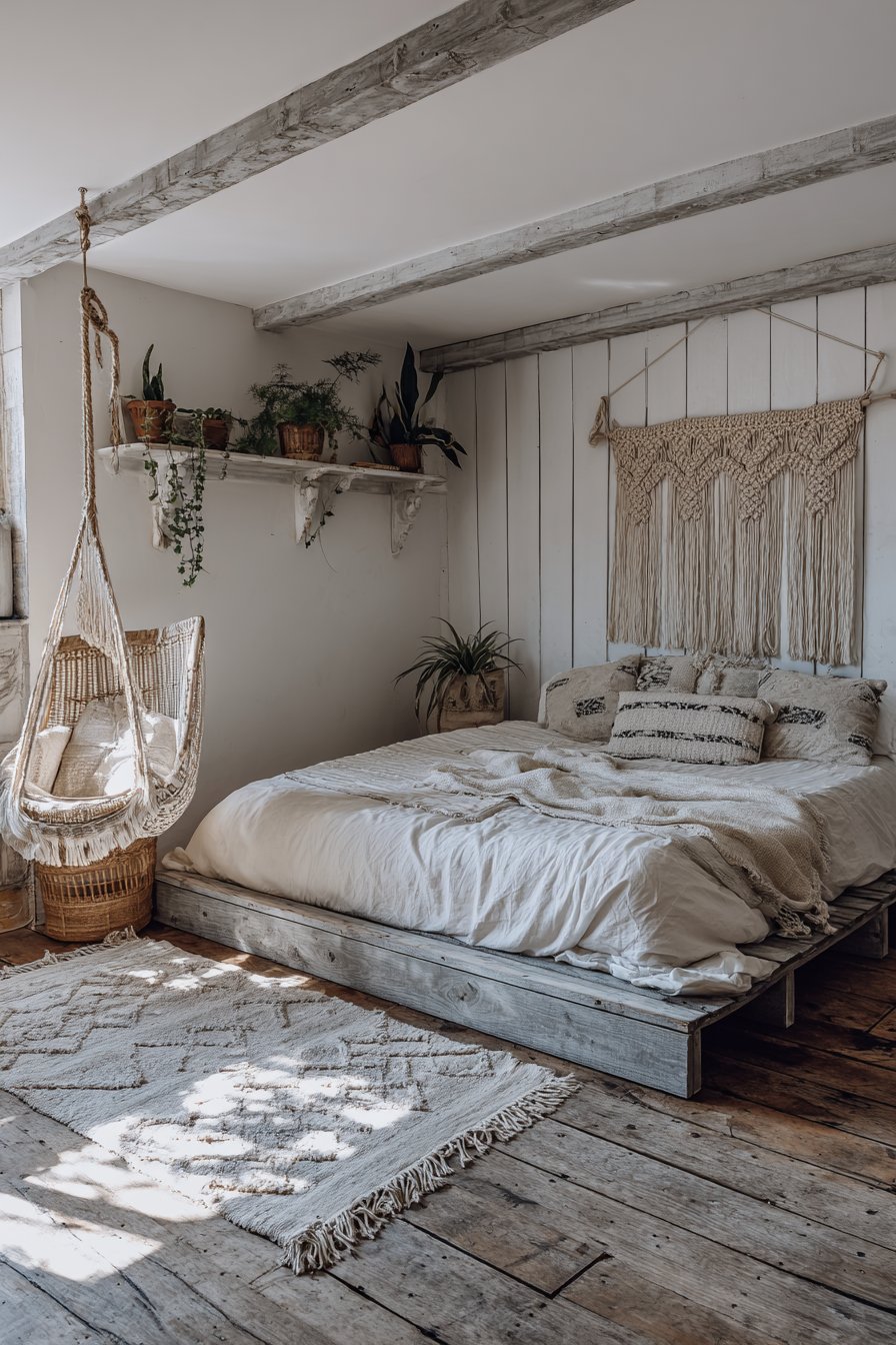 A low platform bed features gray reclaimed wood framing. The simple base allows other elements to shine. A cream macramé headboard wall hanging creates stunning focal art. Intricate knotwork details demonstrate handcrafted beauty. Cream cotton gauze duvet feels soft and relaxed. Gray ikat print pillows add global pattern. A vintage gray and cream throw completes the layering.