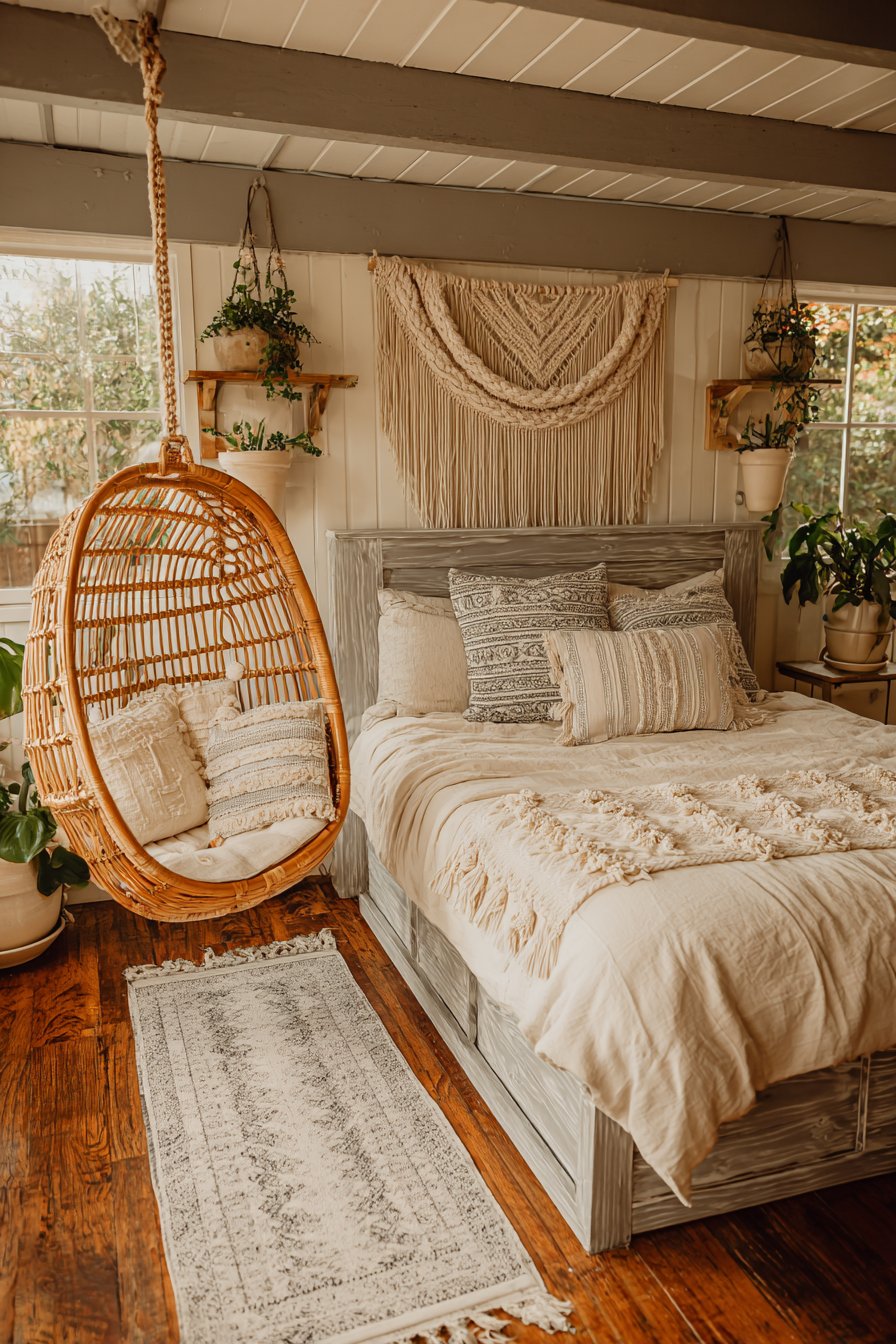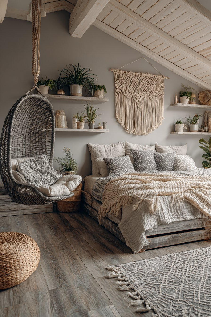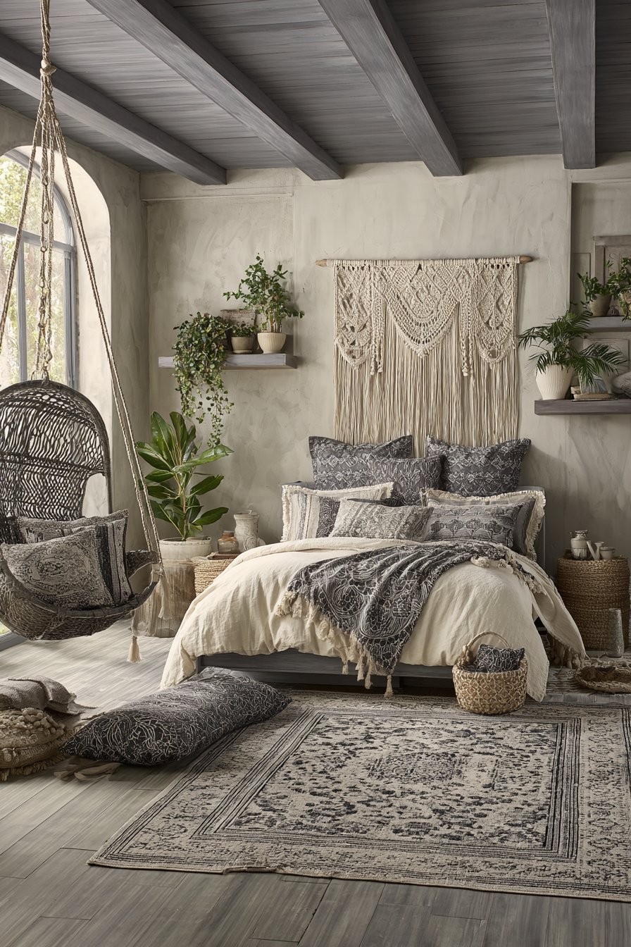 Multiple cream and gray patterned rugs layer over natural wood flooring. This creates relaxed bohemian foundation. A gray rattan hanging chair with cream cushion occupies the corner. Soft cream walls contrast with exposed gray ceiling beams. Potted plants in cream ceramic planters add life. Gray floating shelves display the greenery perfectly.