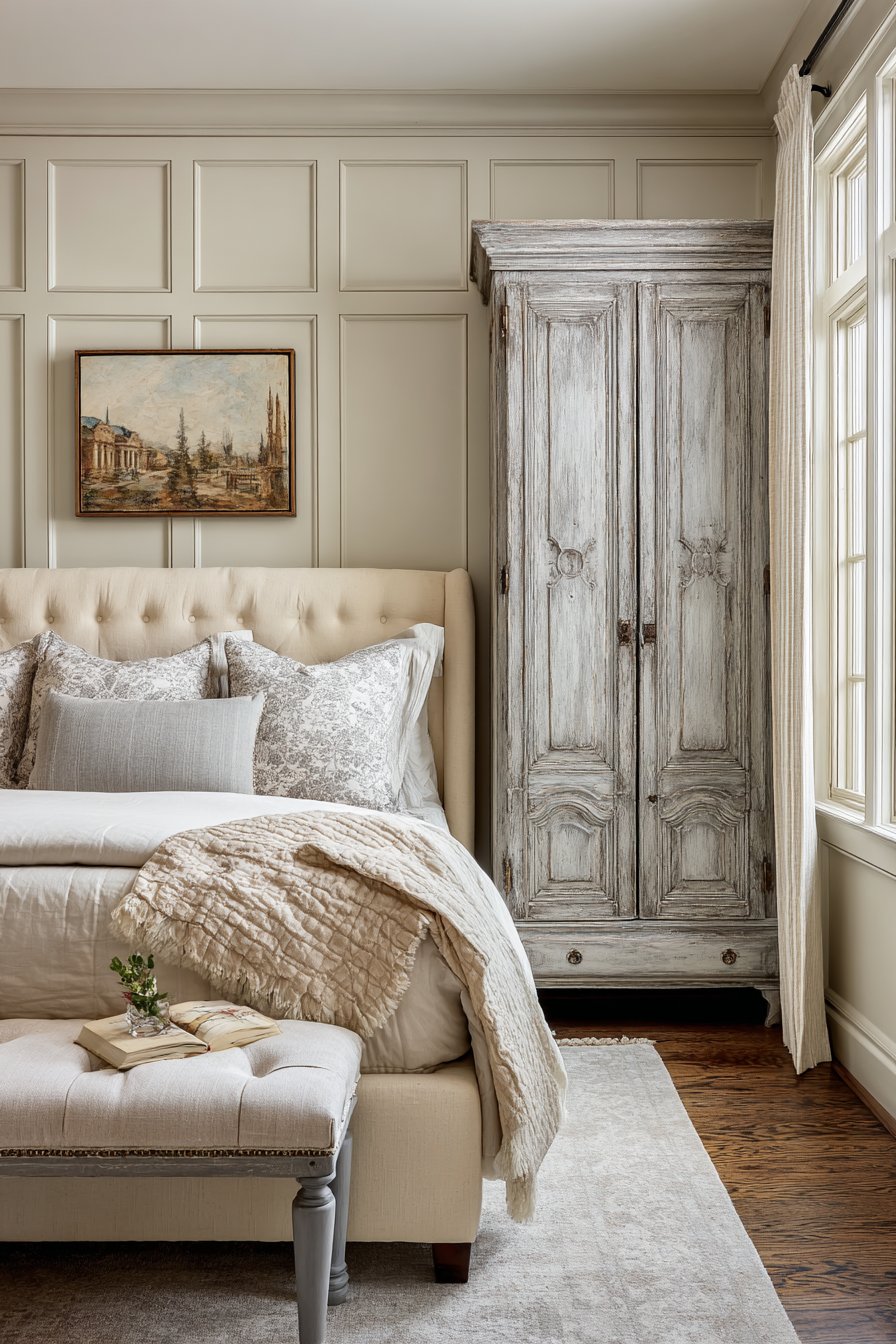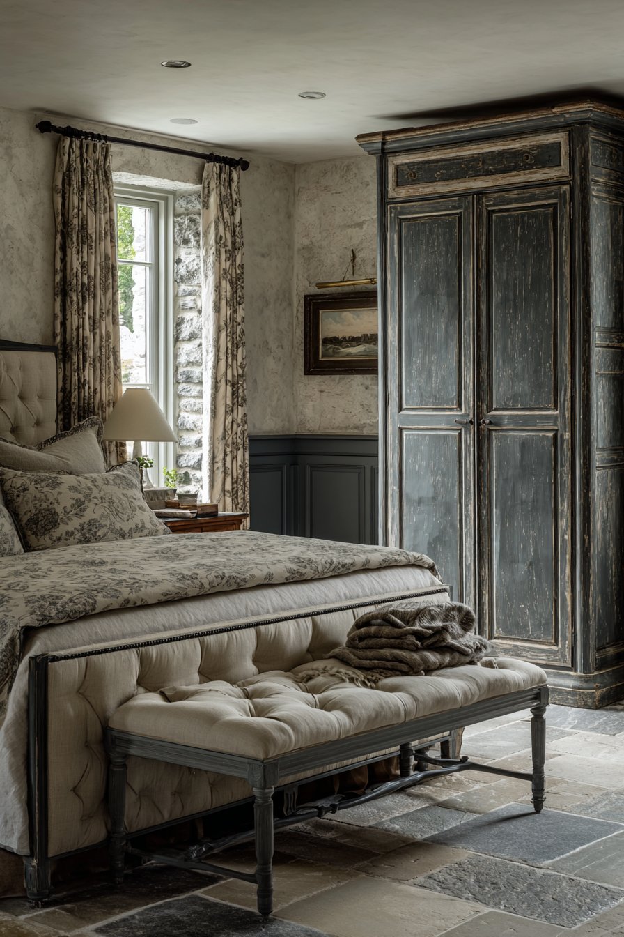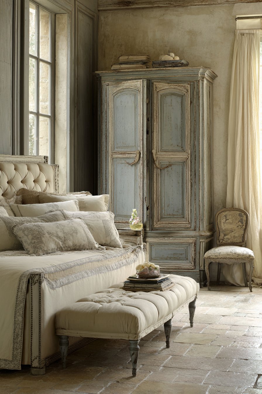 A distressed gray armoire provides wardrobe storage. Cream interior paint peeks through open doors. Authentic wear patterns and original hardware add character. Limestone tile flooring in cream features natural gray veining. This adds provincial authenticity. A cream linen bench sits at the bed foot. Gray painted turned legs add traditional detail.
