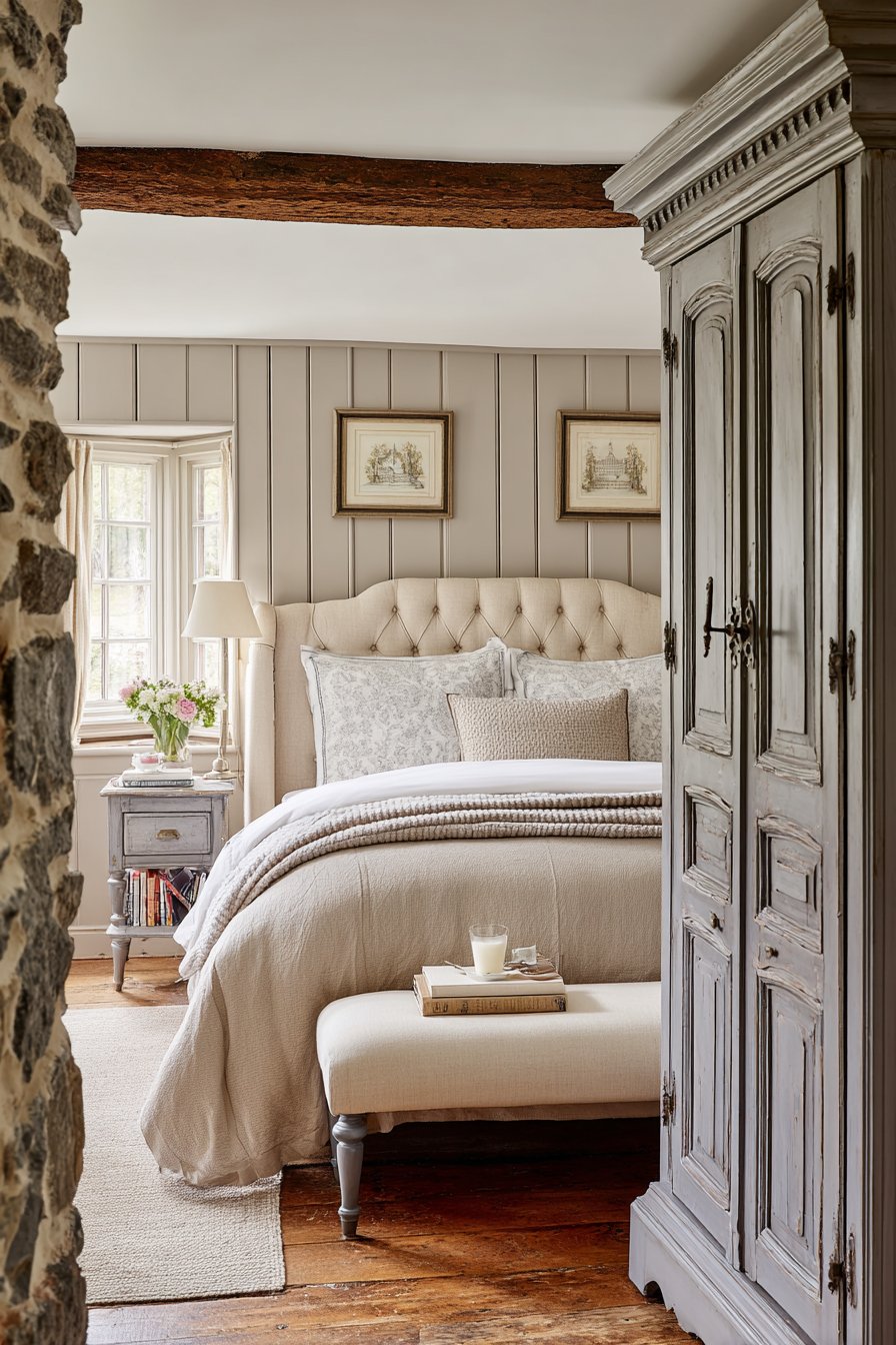 Gray-painted wood paneling creates classic board and batten pattern. This covers the lower walls beautifully. Cream plastered walls above show subtle texture. An upholstered bed in cream linen features gray piping. Button tufting adds traditional detail. Vintage-inspired cream bedding pairs with gray toile pillows.