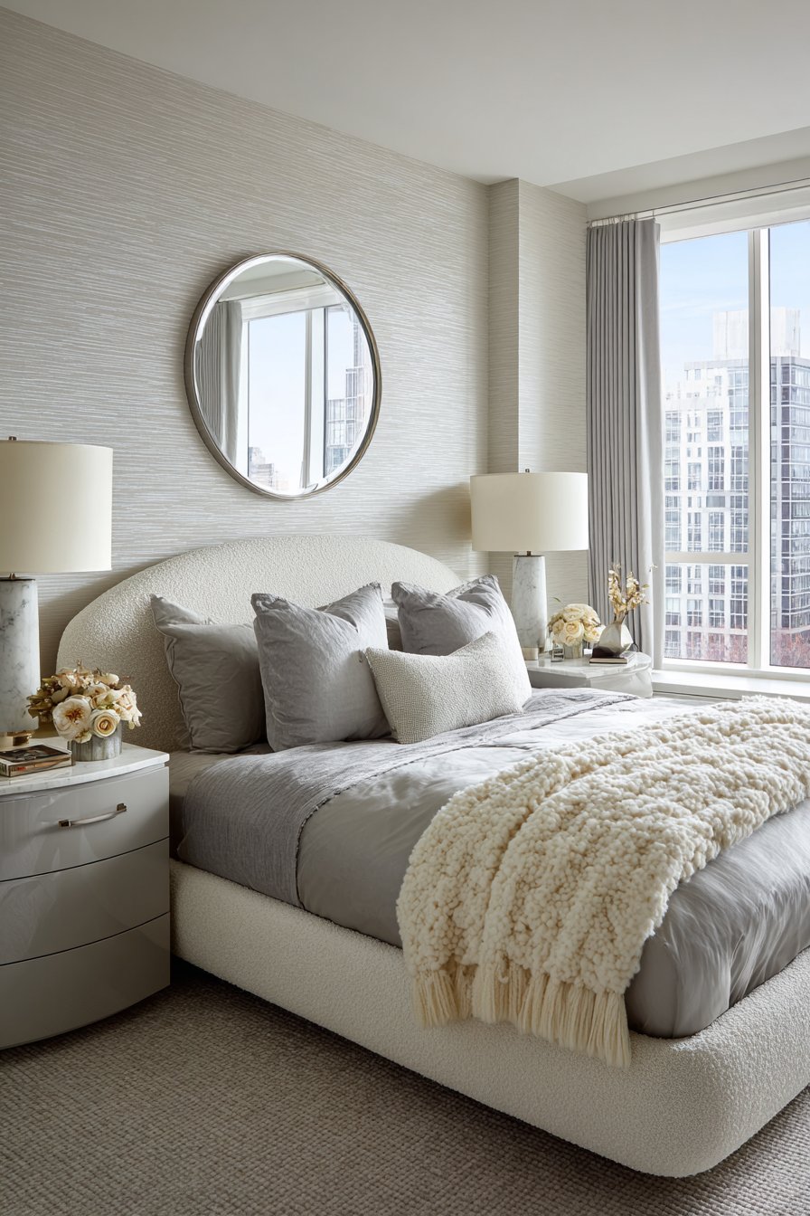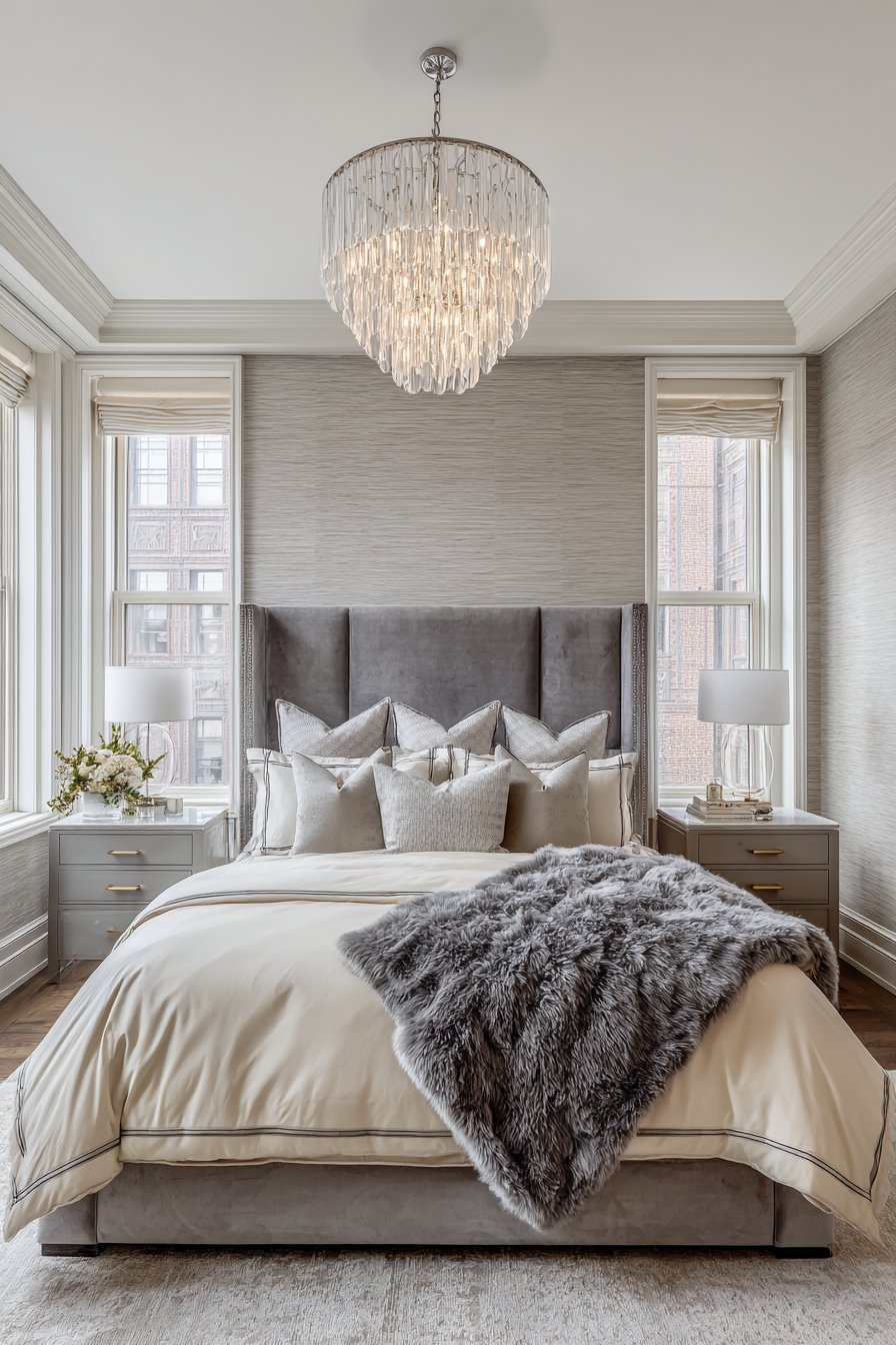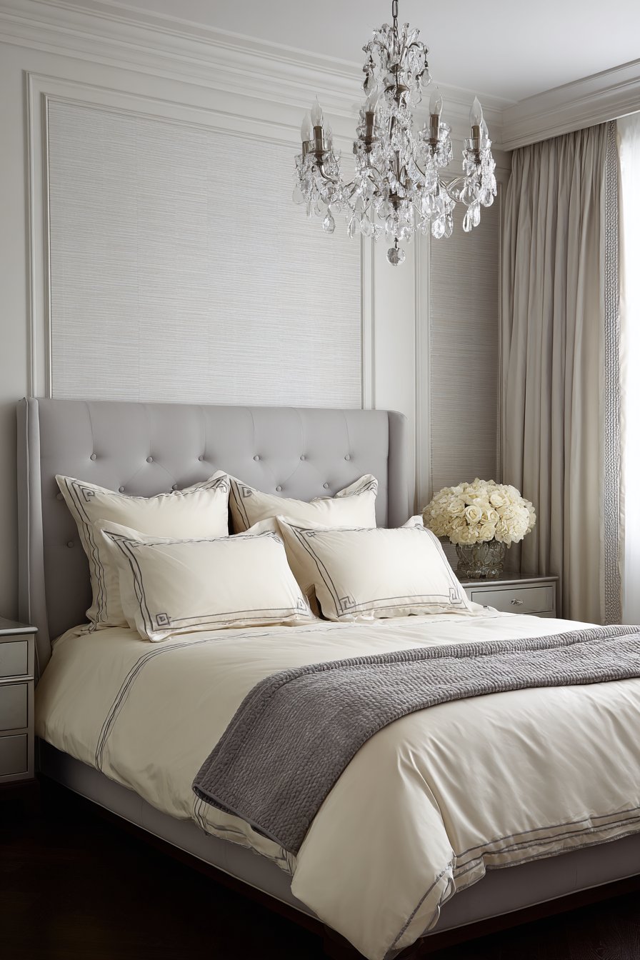 Gray silk bedding feels incredible against skin. Cream cashmere throw adds ultimate luxury. Lacquered nightstands in high-gloss gray reflect light. Cream onyx tops provide natural stone glamour. Cream textured wallpaper features metallic threads. These create subtle pattern that shifts with light.
