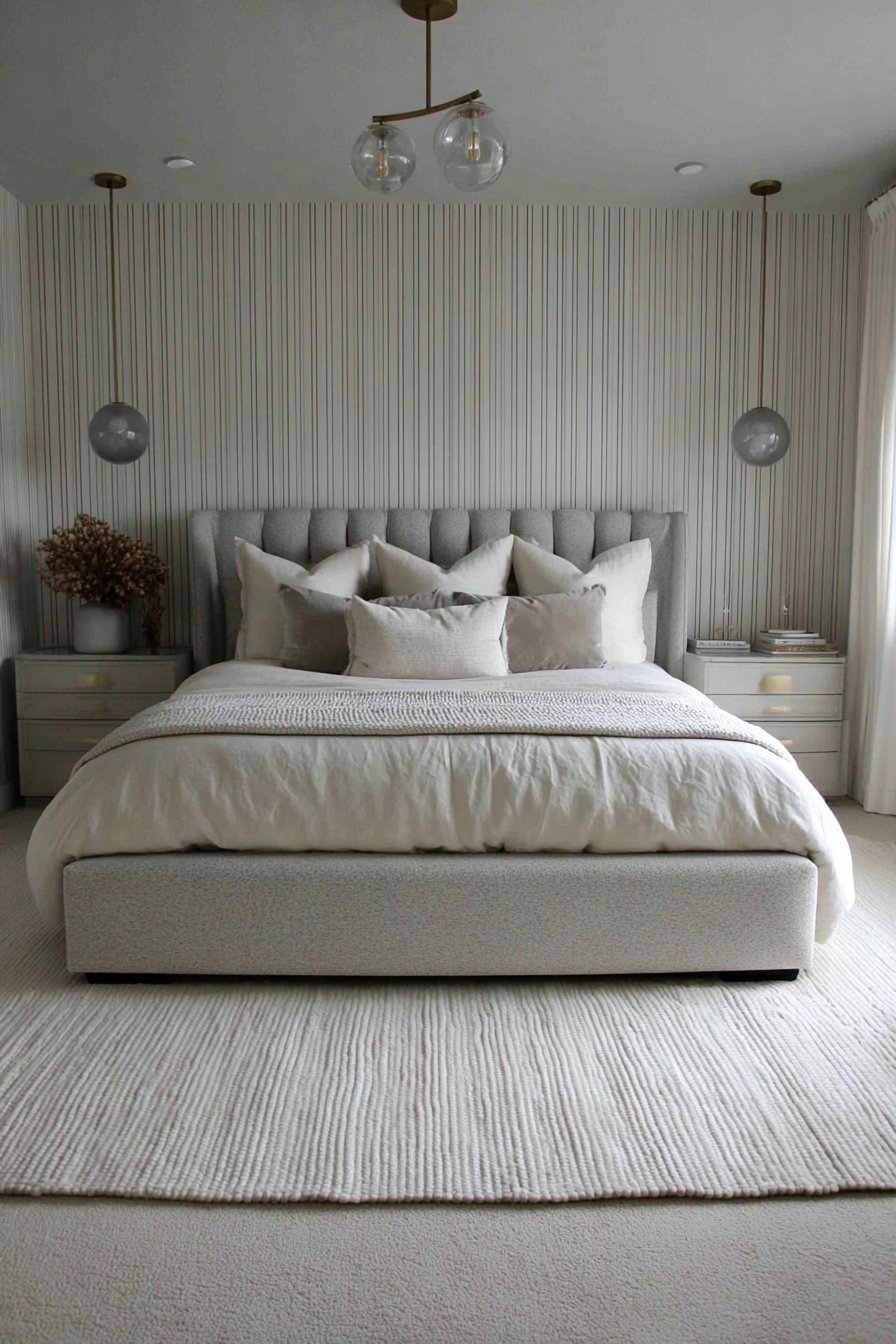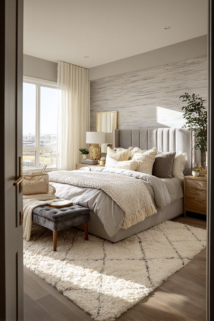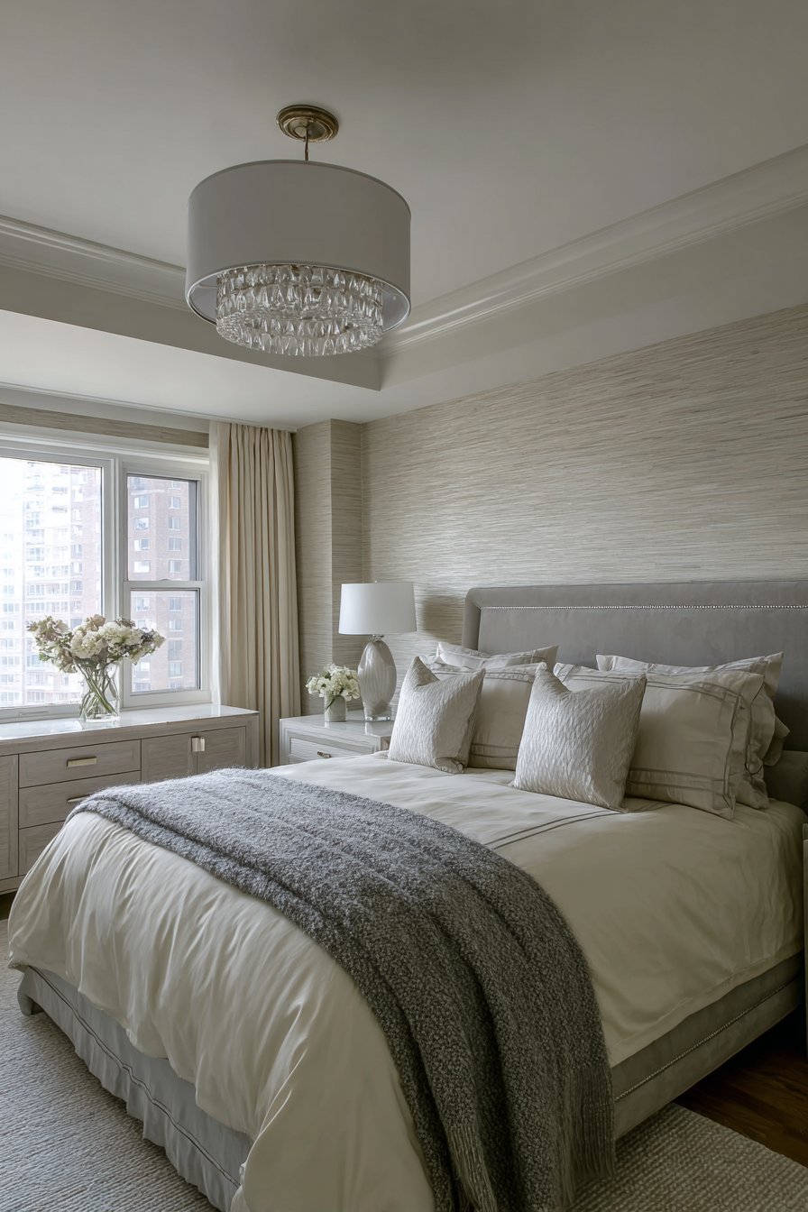 Gray silk bedding feels incredible against skin. Cream cashmere throw adds ultimate luxury. Lacquered nightstands in high-gloss gray reflect light. Cream onyx tops provide natural stone glamour. Cream textured wallpaper features metallic threads. These create subtle pattern that shifts with light.