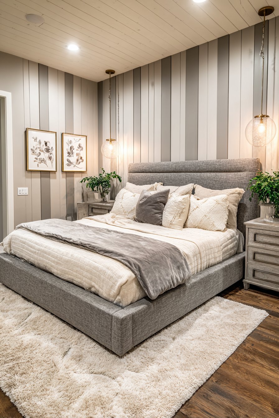 A feature wall showcases vertical shiplap in alternating gray and cream. This creates subtle striped effect with dimensional interest. The upholstered bed in heathered gray performance fabric resists stains. Matching upholstered nightstands integrate into the headboard design. This creates seamless built-in appearance.