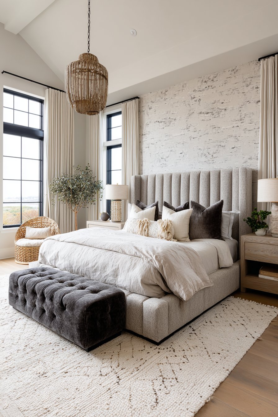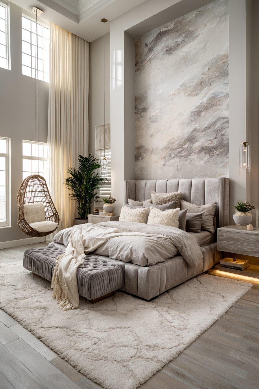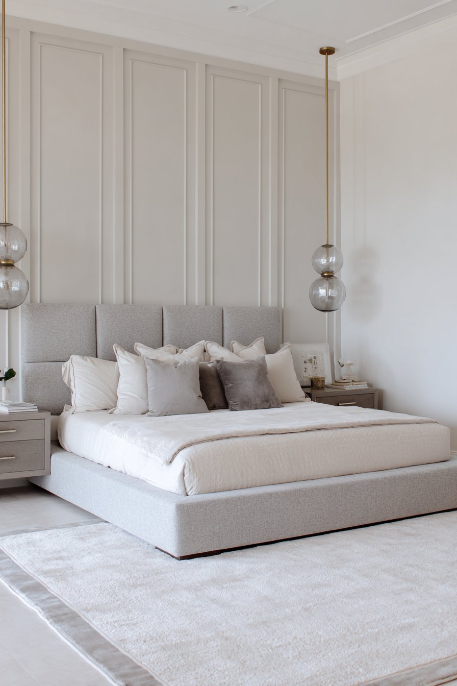 A tall upholstered headboard in pearl gray velvet makes a stunning statement. The fabric has subtle sheen that catches light beautifully. The headboard extends to the ceiling for maximum impact. Hotel-quality cream Egyptian cotton sheets feel incredible. Gray satin piping detail adds refined finishing. A plush gray cashmere throw folds at the bed foot.