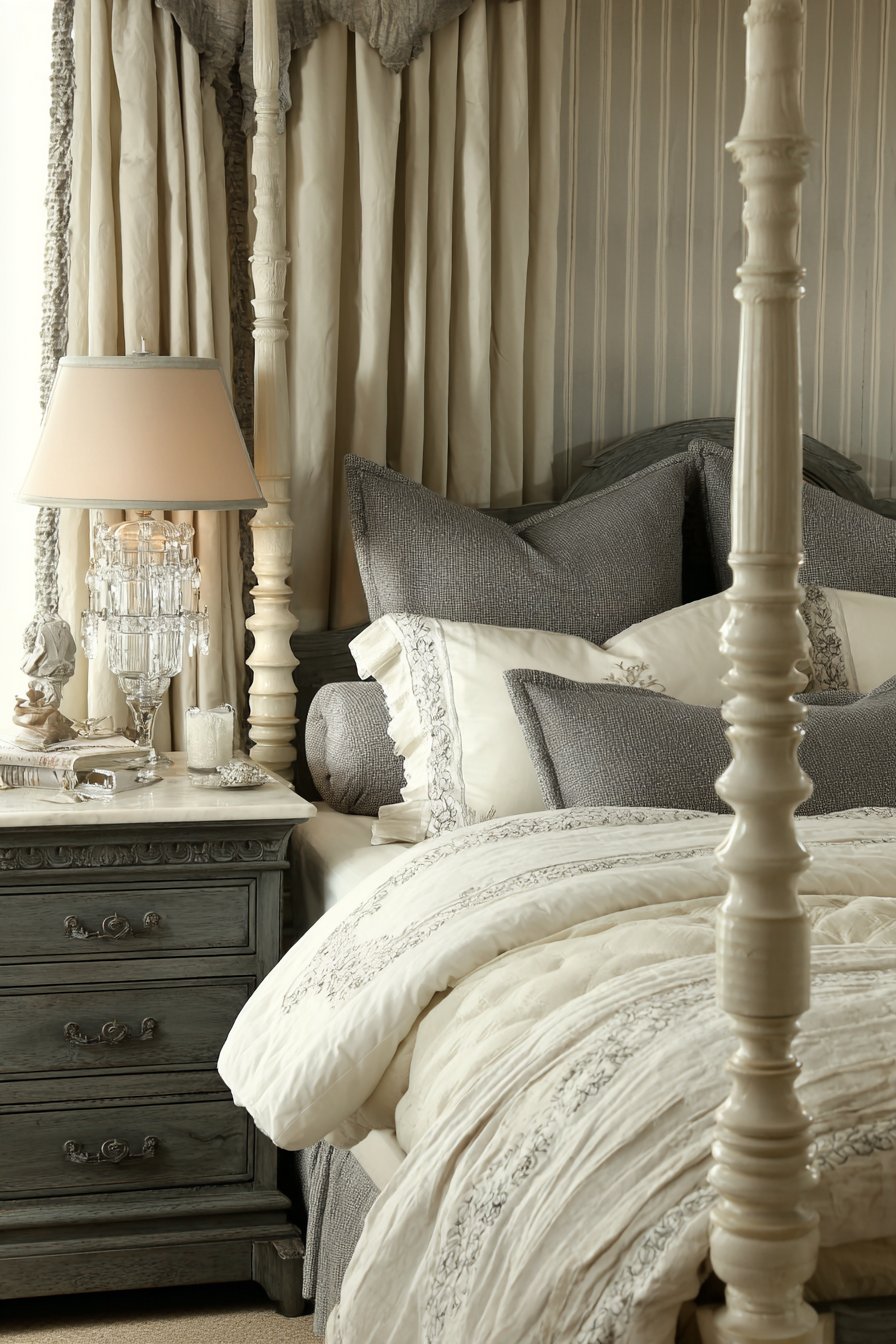 This bedroom shows how romantic style can feel sophisticated. The gray tones ground the cream elements. The combination avoids excessive sweetness while maintaining softness.