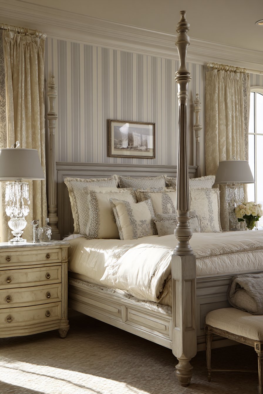 Cream marble tops add natural stone beauty. Traditional brass pulls provide warm metallic hardware. Cream striped wallpaper with gray pattern creates vertical lines. This makes ceilings appear higher. Crystal table lamps sit on each nightstand. Gray silk shades provide soft lighting. Cream drapery with gray trim frames tall windows. Tassels add traditional finishing detail.