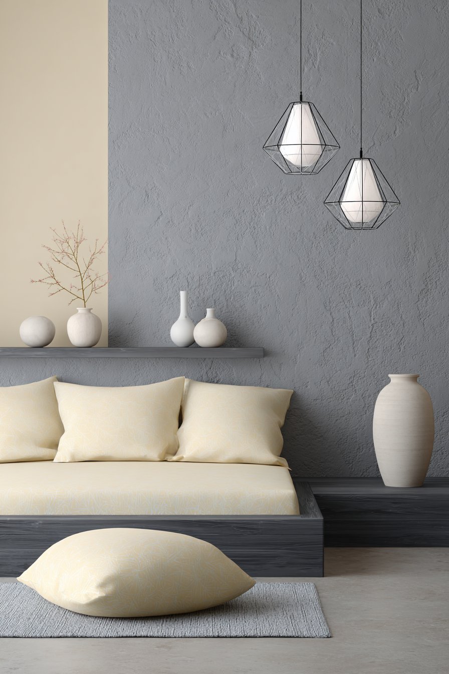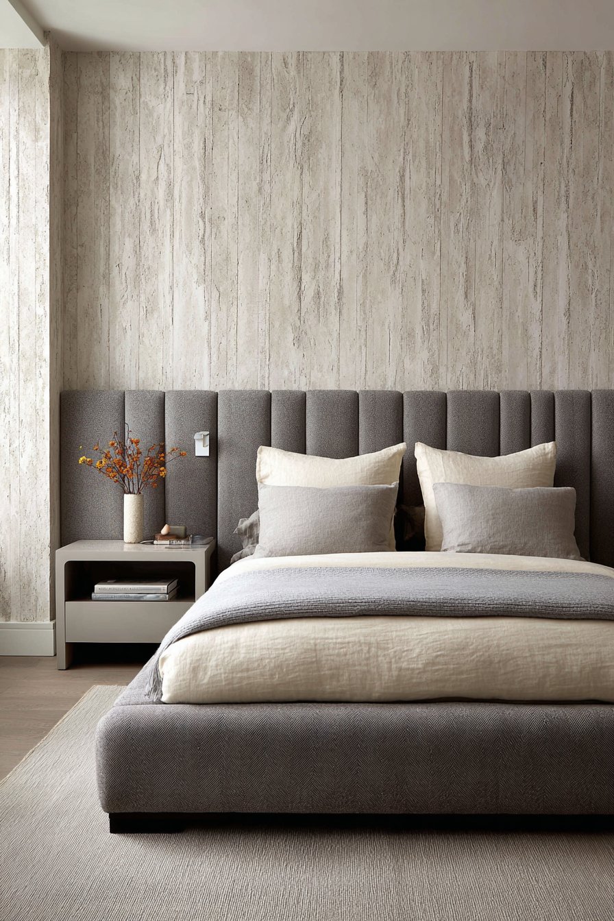 A low-profile platform bed defines this contemporary sanctuary. The gray fabric headboard features vertical channeling detail. This creates subtle texture without overwhelming the minimalist aesthetic. Premium Belgian linen sheets in natural cream feel luxurious. A lightweight gray cotton duvet adds comfort. Oversized Euro pillows alternate between gray and cream tones.
