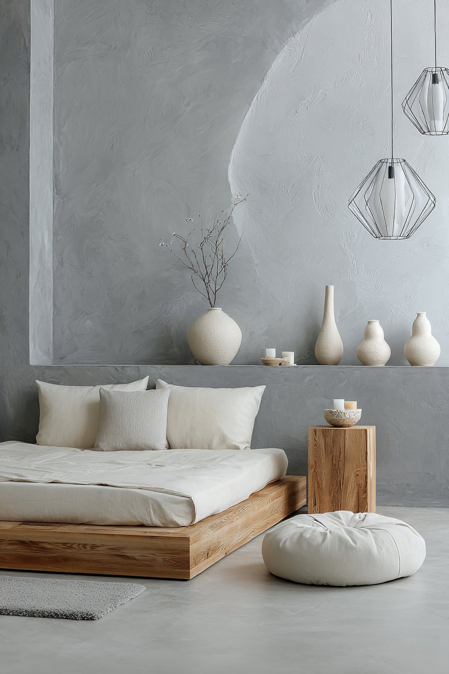 Smooth concrete floors in natural gray create modern foundation. Matte sealing protects without adding shine. A low Japanese-inspired platform bed features gray-stained teak. Integrated side tables eliminate clutter. Simple cream cotton bedding has minimal ornamentation. The restraint feels intentional and peaceful.