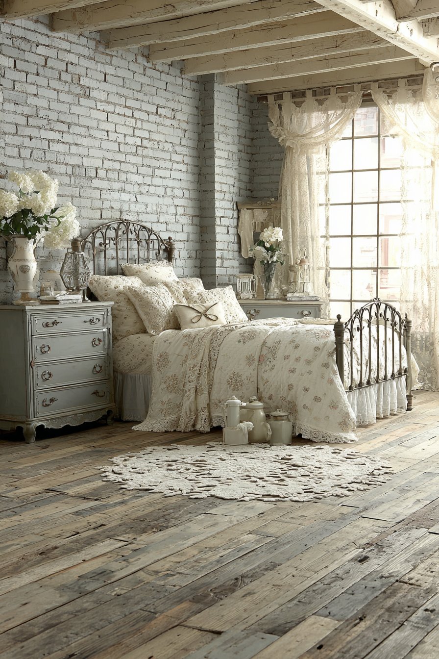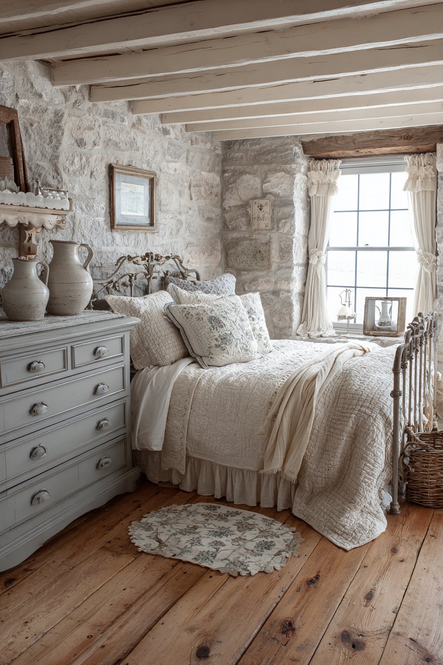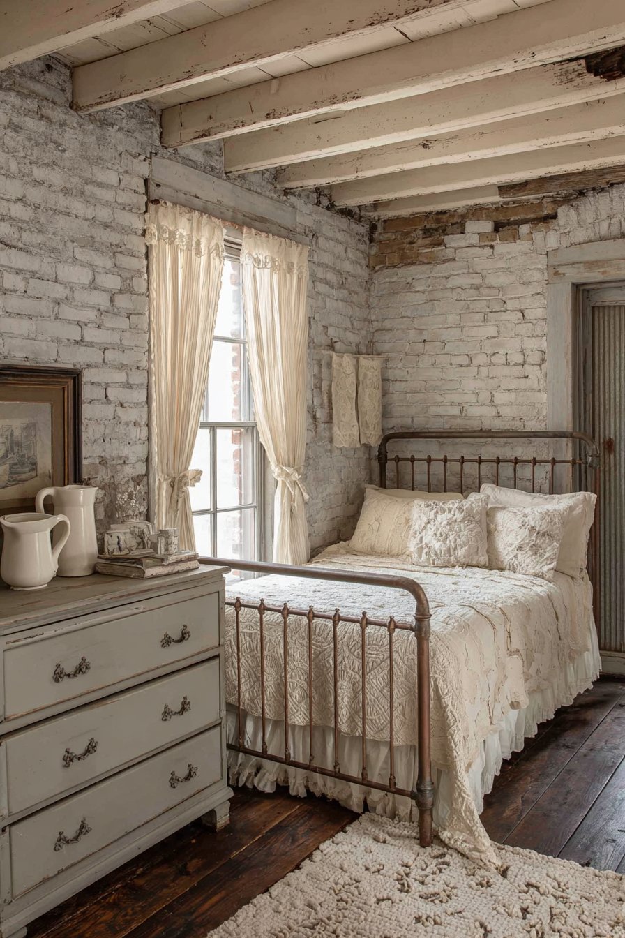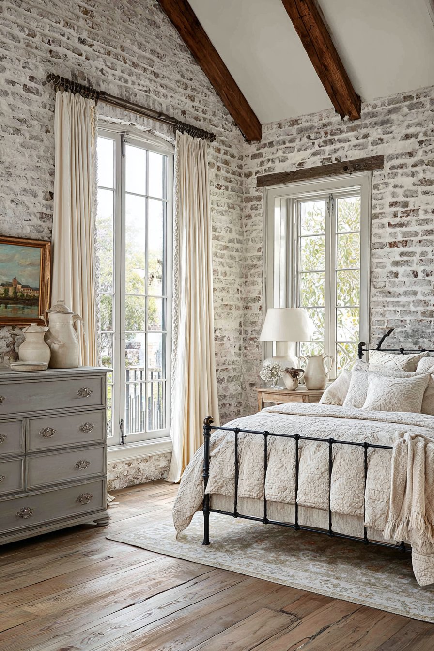 Painted brick walls in soft gray show authentic texture. Mortar lines remain visible for character. Cream painted wood ceiling features exposed beams. An iron bed frame in warm gray displays decorative castings. Cream vintage quilt adds handmade charm. Gray and cream patchwork pillows complete the cottage look.