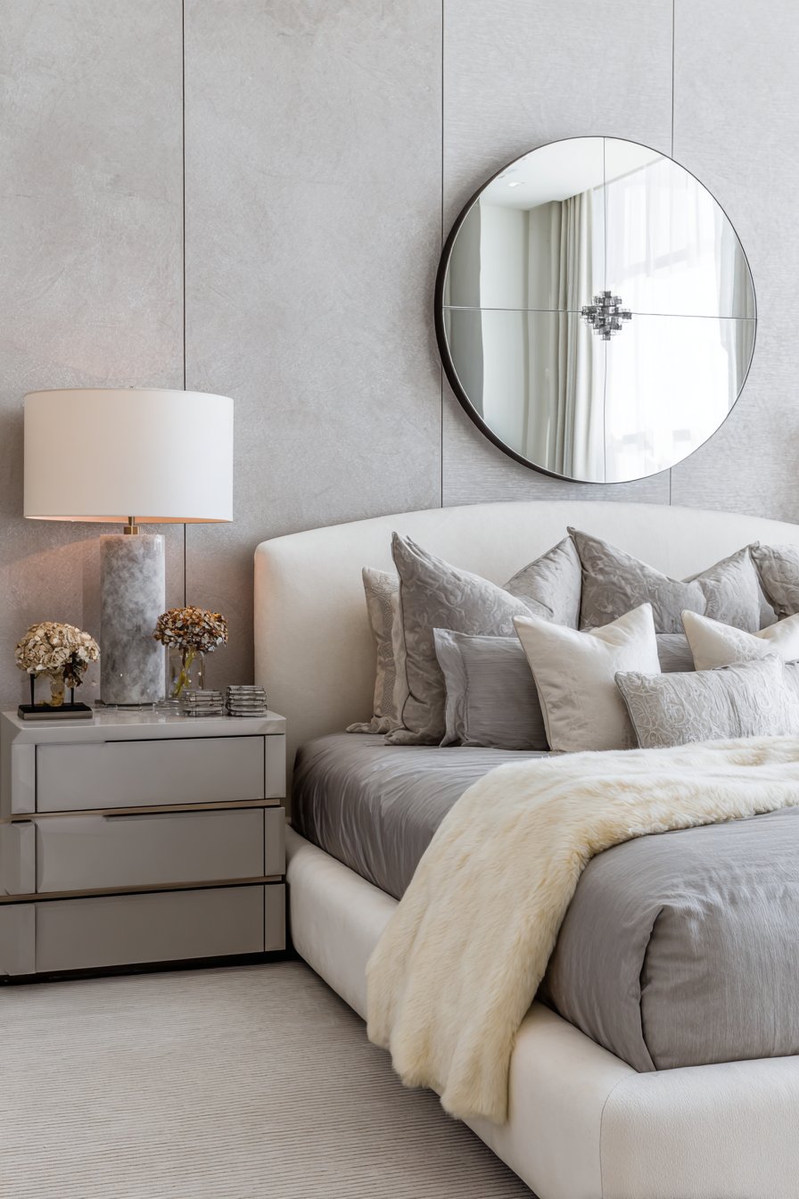 A large circular mirror with gray lacquer frame hangs above the bed. It reflects light throughout the space. Modern table lamps feature gray marble bases. Cream silk shades provide sophisticated lighting. Professional lighting captures luxurious material combinations. Both matte and reflective surfaces shine appropriately.