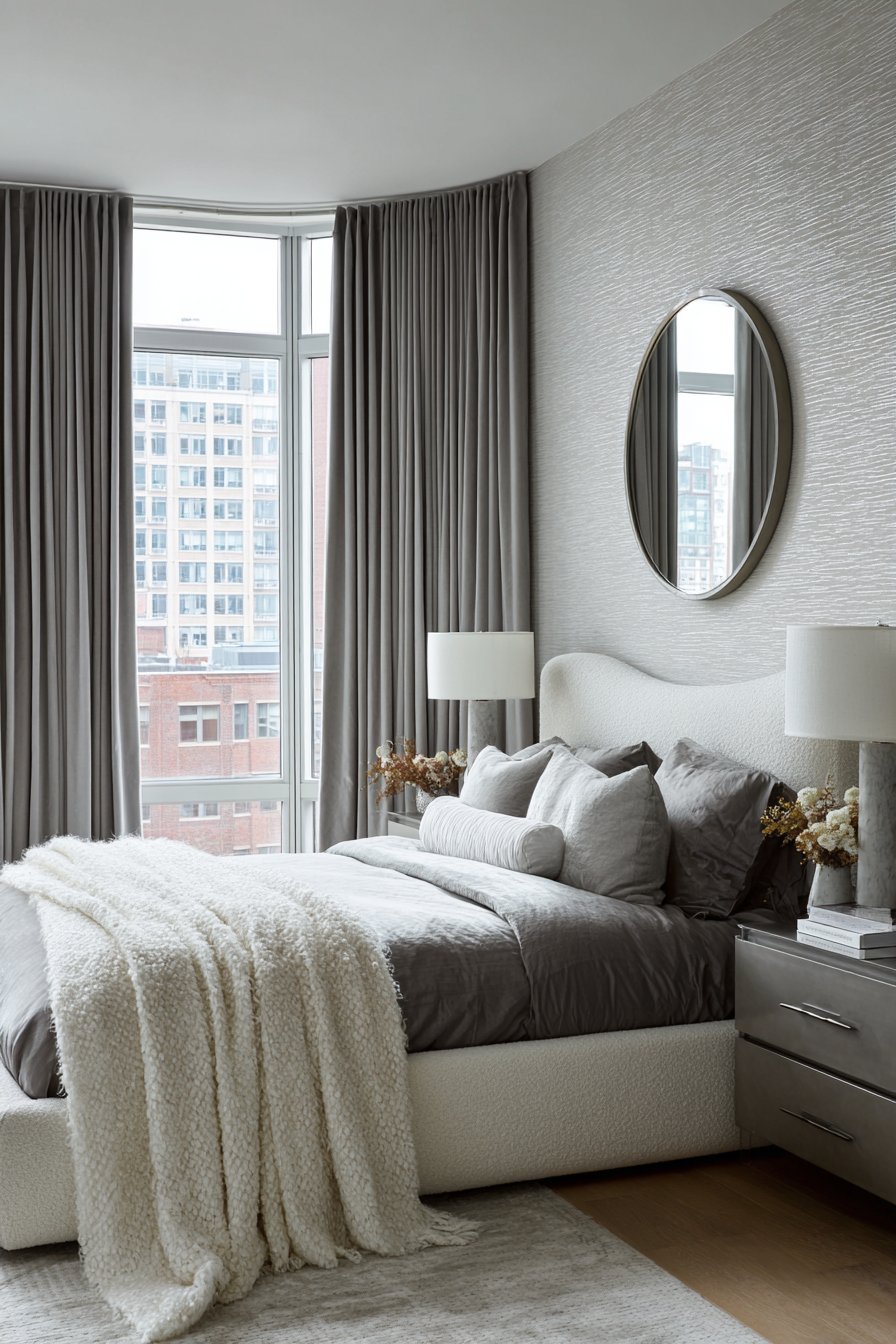 Floor-to-ceiling gray velvet curtains create dramatic impact. Subtle sheen catches light beautifully throughout the day. The fabric puddles slightly on the floor. This adds luxurious excess. An upholstered bed in cream bouclé fabric features oversized curved headboard. This creates stunning statement piece.