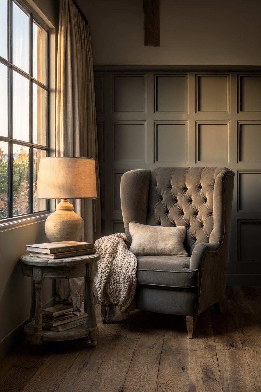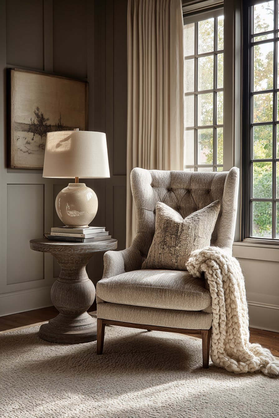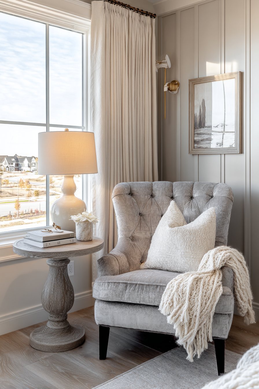 A tufted gray velvet wingback chair creates an elegant focal point. This statement piece sits beside a tall cream-painted window frame. Flowing linen drapery adds softness and movement. A small round side table in weathered gray wood provides function. It holds a ceramic table lamp with cream shade. A stack of hardcover books adds personality.