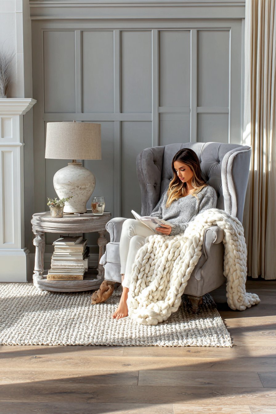 Board and batten paneling creates architectural interest on the walls. Gray tones appear below the chair rail. Cream covers the upper portion. This classic treatment adds dimension and character. Natural oak flooring introduces warmth to the cool palette. A chunky knit cream throw drapes casually over the chair arm.
