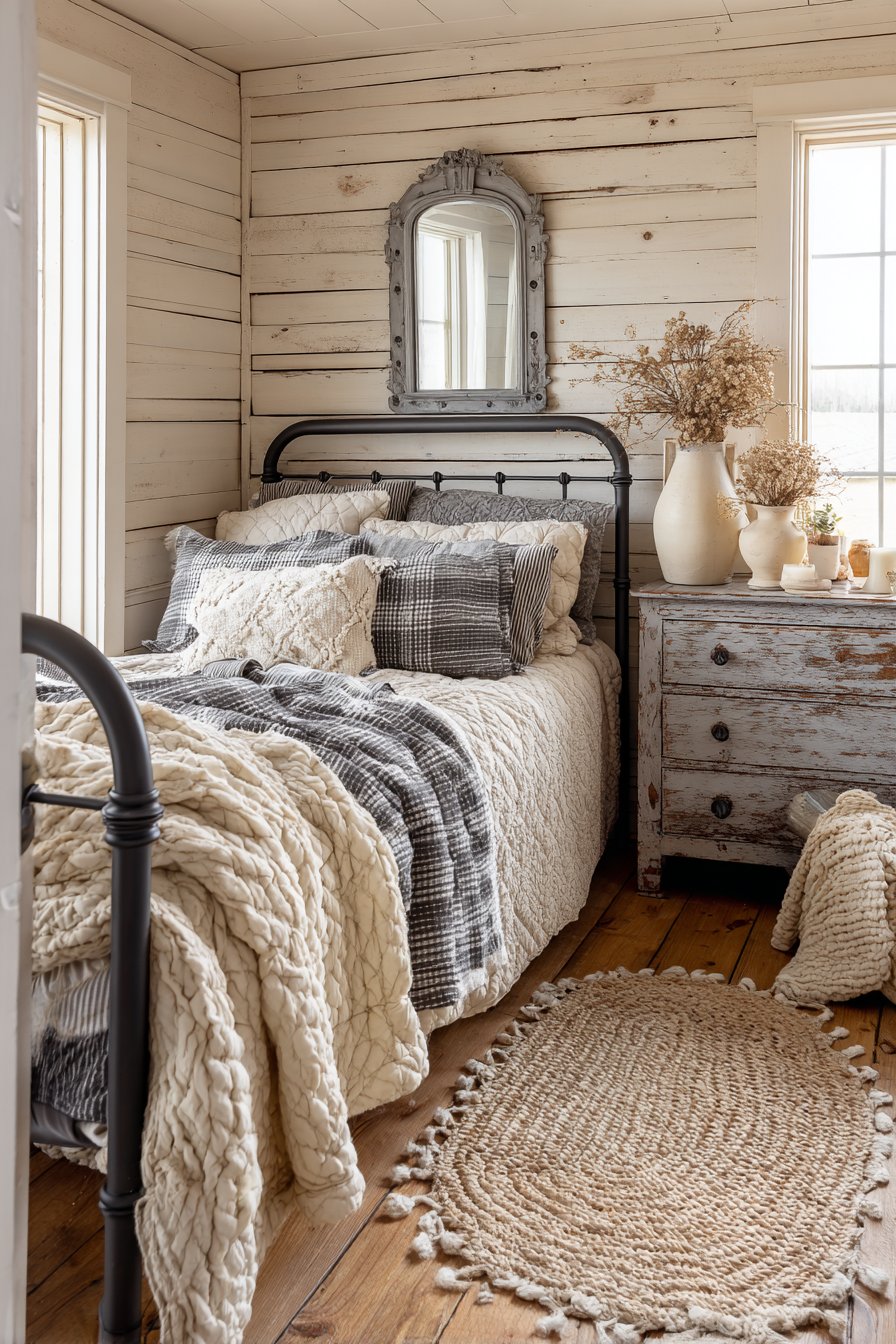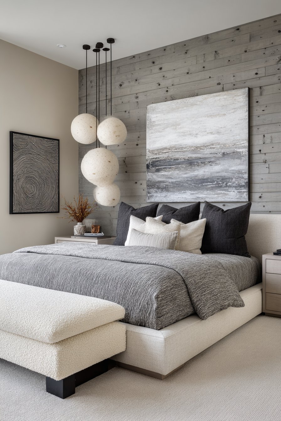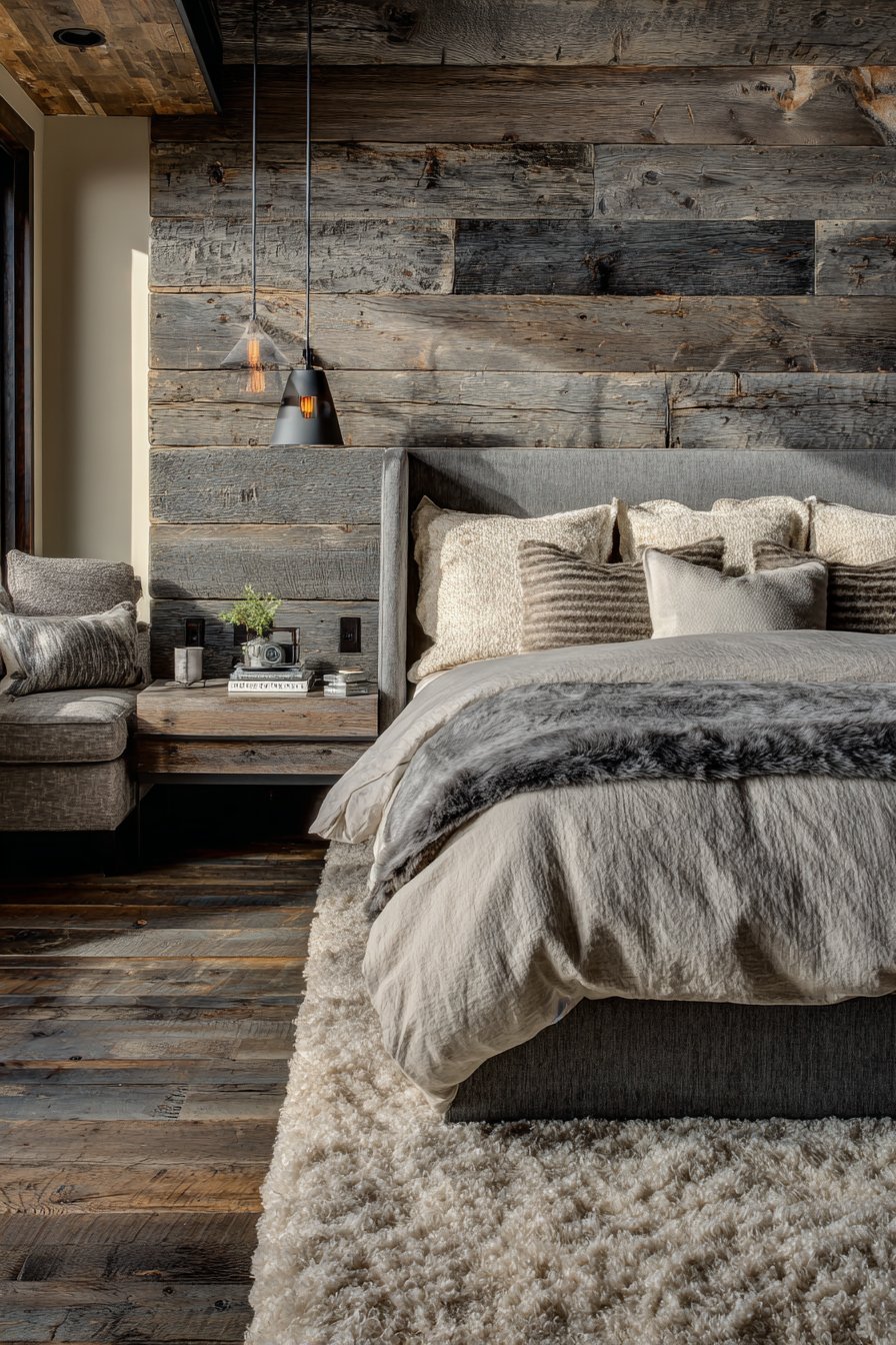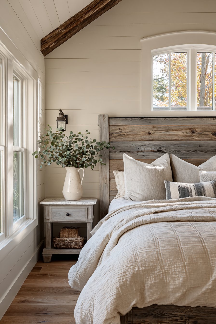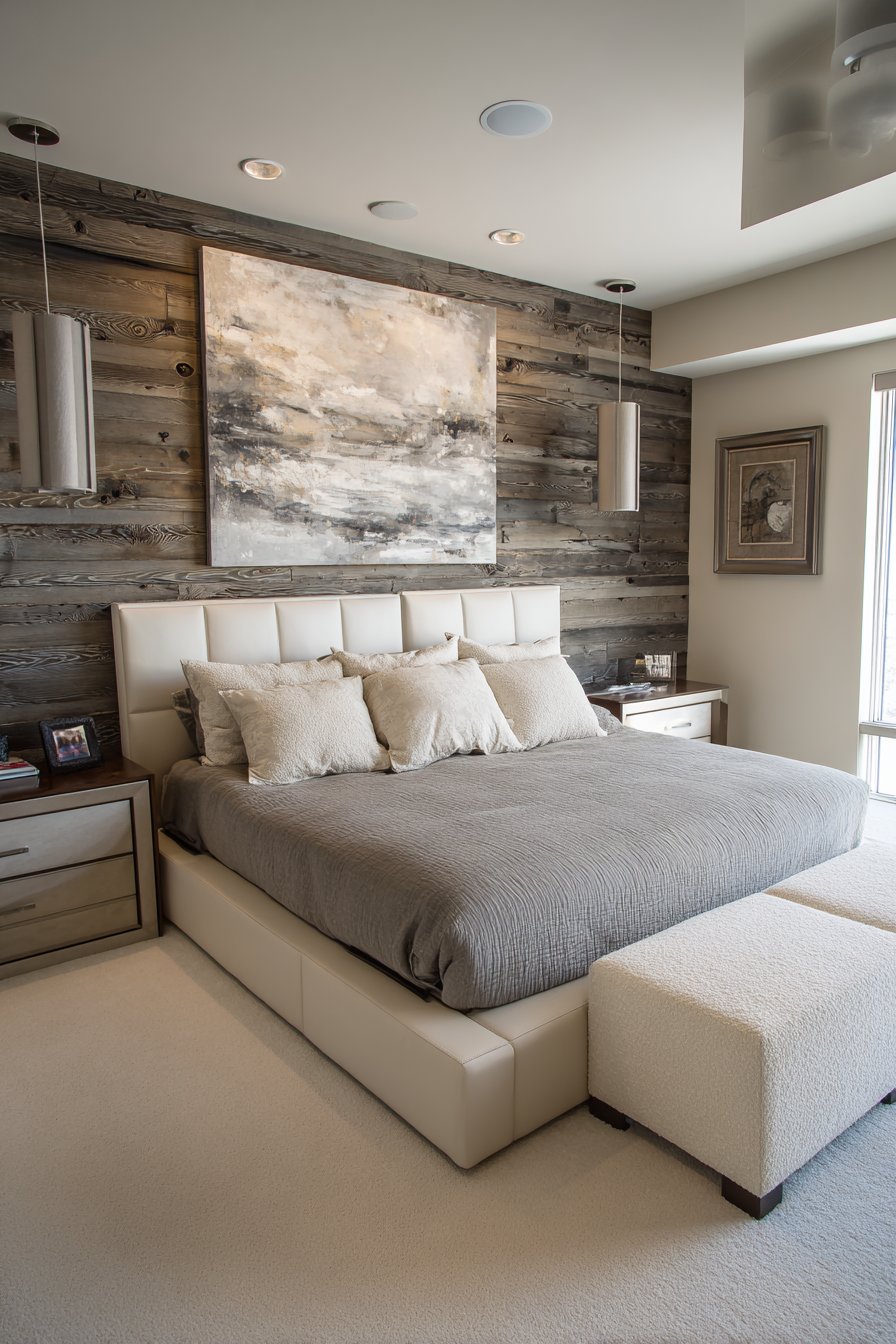 A rough-hewn gray reclaimed wood accent wall creates stunning focal point. Natural weathering and nail holes tell authentic stories. Smooth cream painted plaster covers remaining walls. This creates perfect contrast. Gray linen upholstered headboard balances rustic and refined. Cream bedding in mixed natural textures feels inviting.