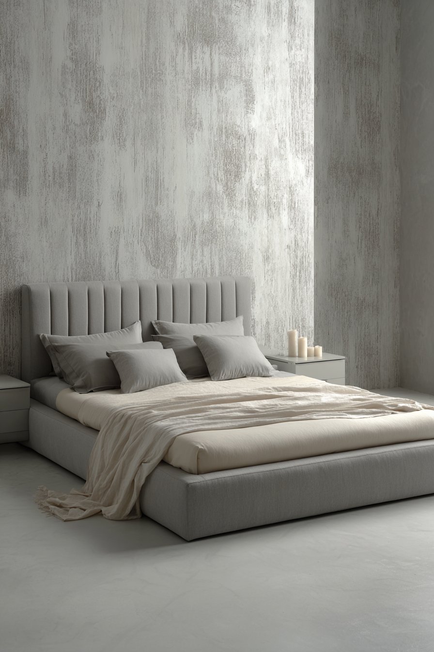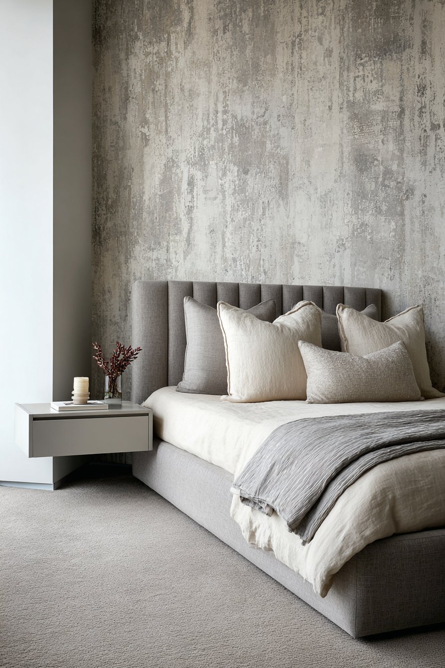 A single floating nightstand in pale gray lacquer provides streamlined storage. Integrated LED lighting eliminates the need for table lamps. This maintains clean lines throughout the space. The accent wall behind the bed showcases textured wallpaper. Abstract gray brushstrokes appear on a cream background.