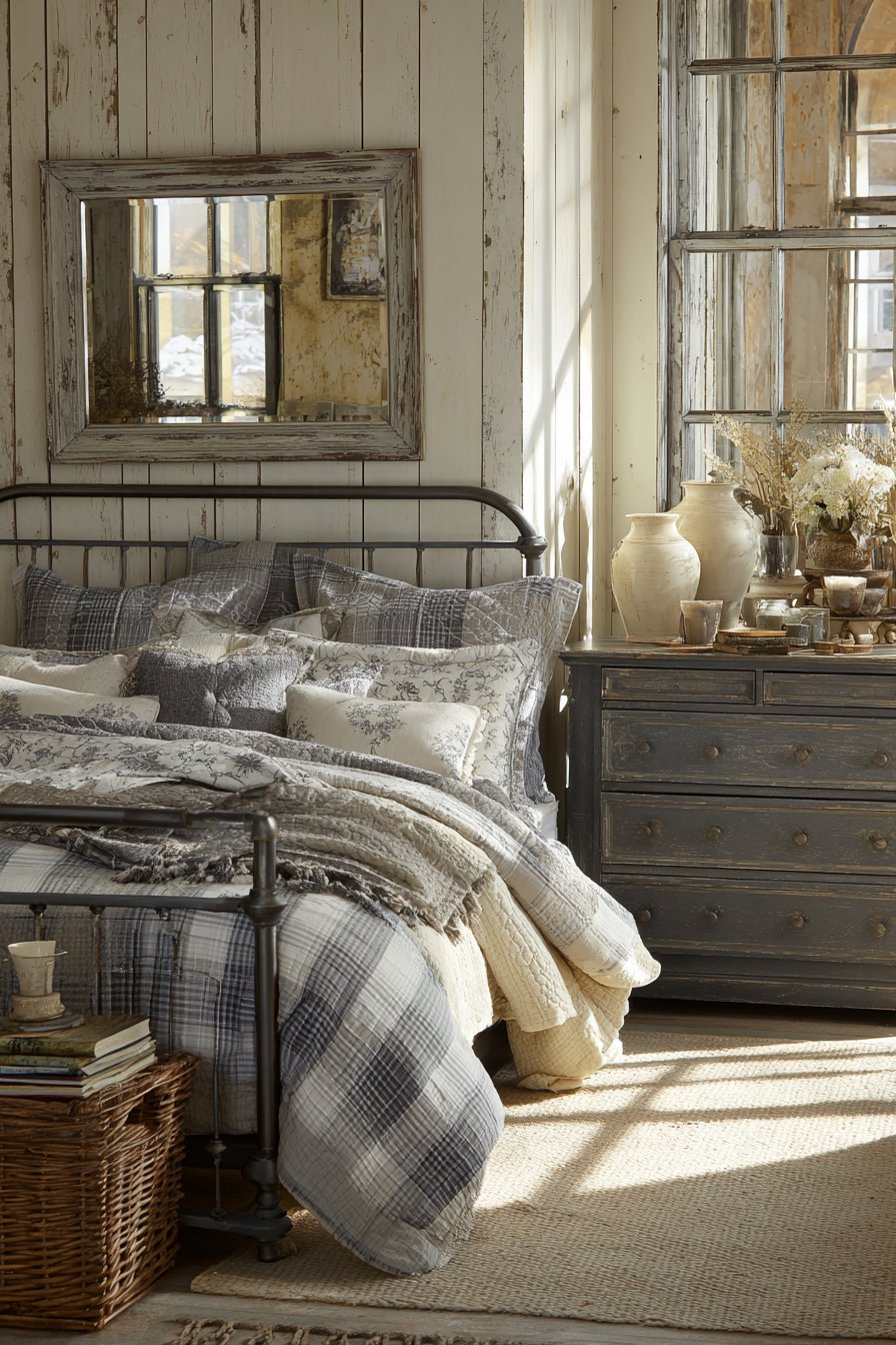 An iron bed frame in matte charcoal gray brings vintage charm. The metal framework features timeless design that never dates. Vintage-inspired cream quilted bedding adds comfort and nostalgia. Multiple throw pillows showcase mixed gray patterns. Stripes, checks, and florals create eclectic interest.