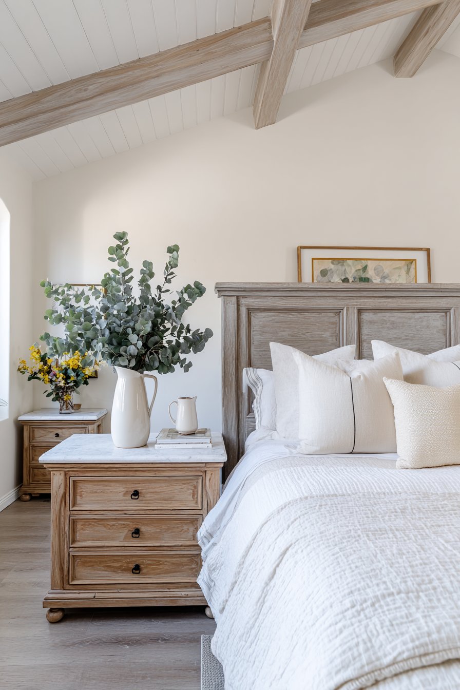 Gray-washed nightstands with turned legs flank the bed. Cream marble tops add elegance to the farmhouse style. Visible dovetail drawer construction demonstrates quality craftsmanship. A cream ceramic pitcher holds fresh eucalyptus branches. This brings life and natural scent to the space.