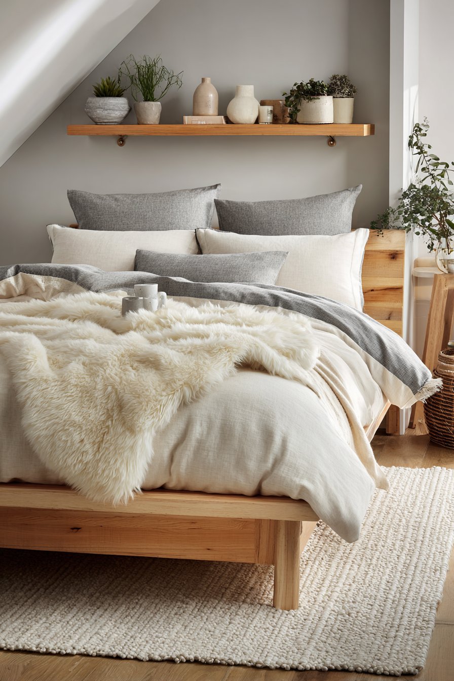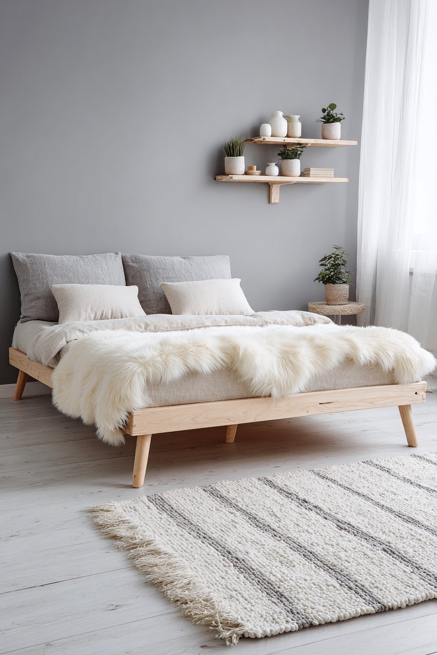 A simple wooden bed frame in natural ash embodies Scandinavian design. Gray-painted legs and headboard add color subtly. Minimalist bedding includes cream linen duvet cover. Gray topstitching detail provides gentle contrast. A sheepskin throw in natural cream drapes across one corner.