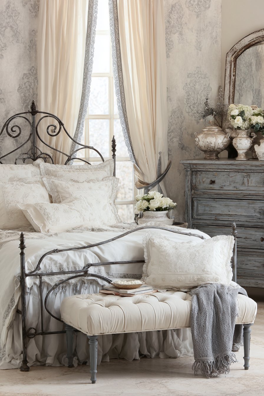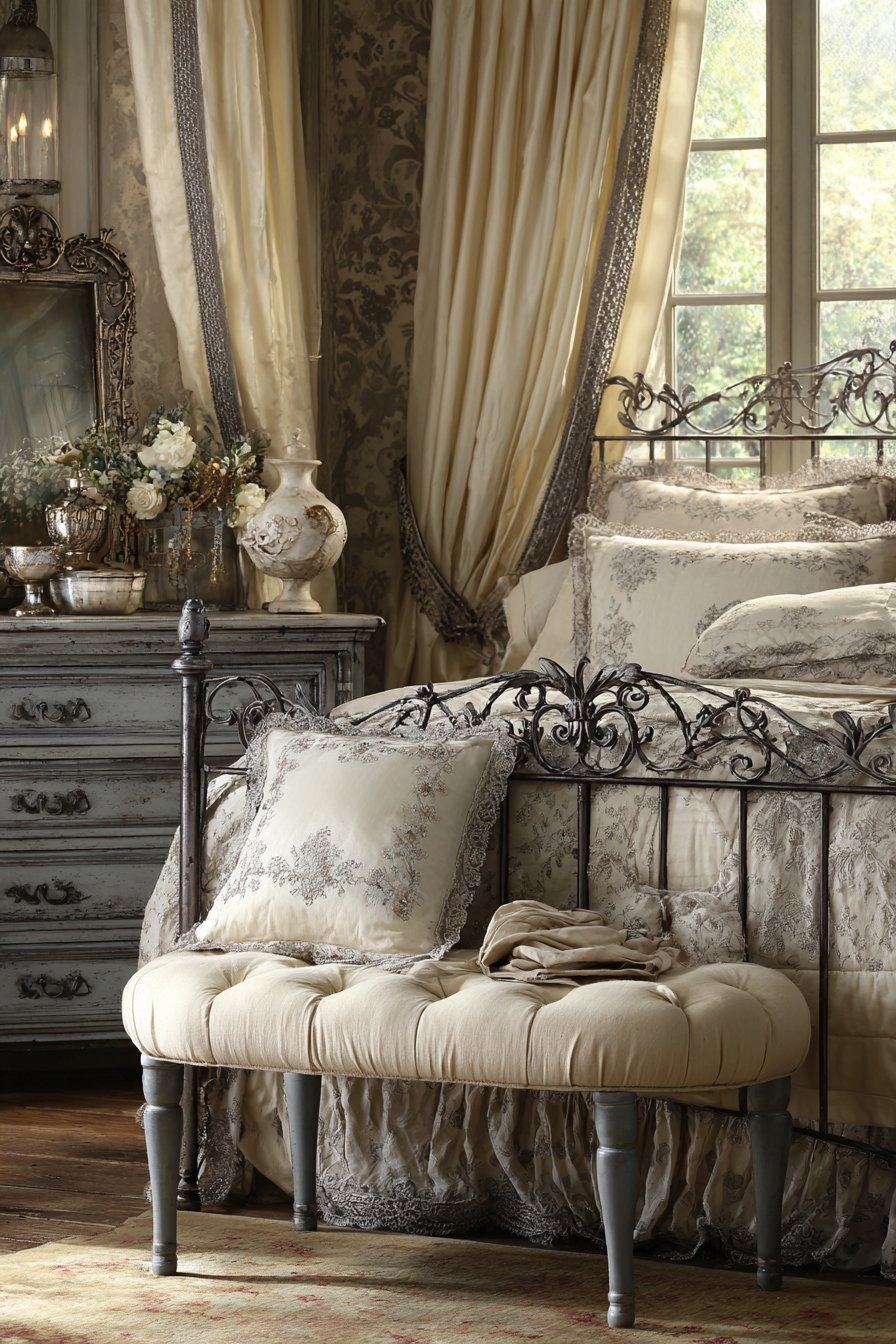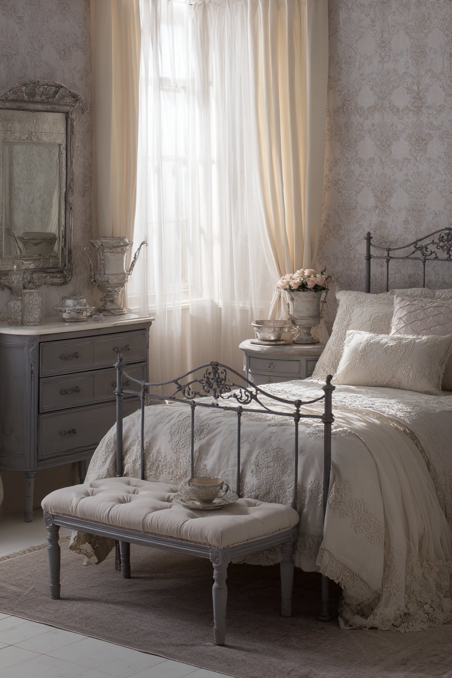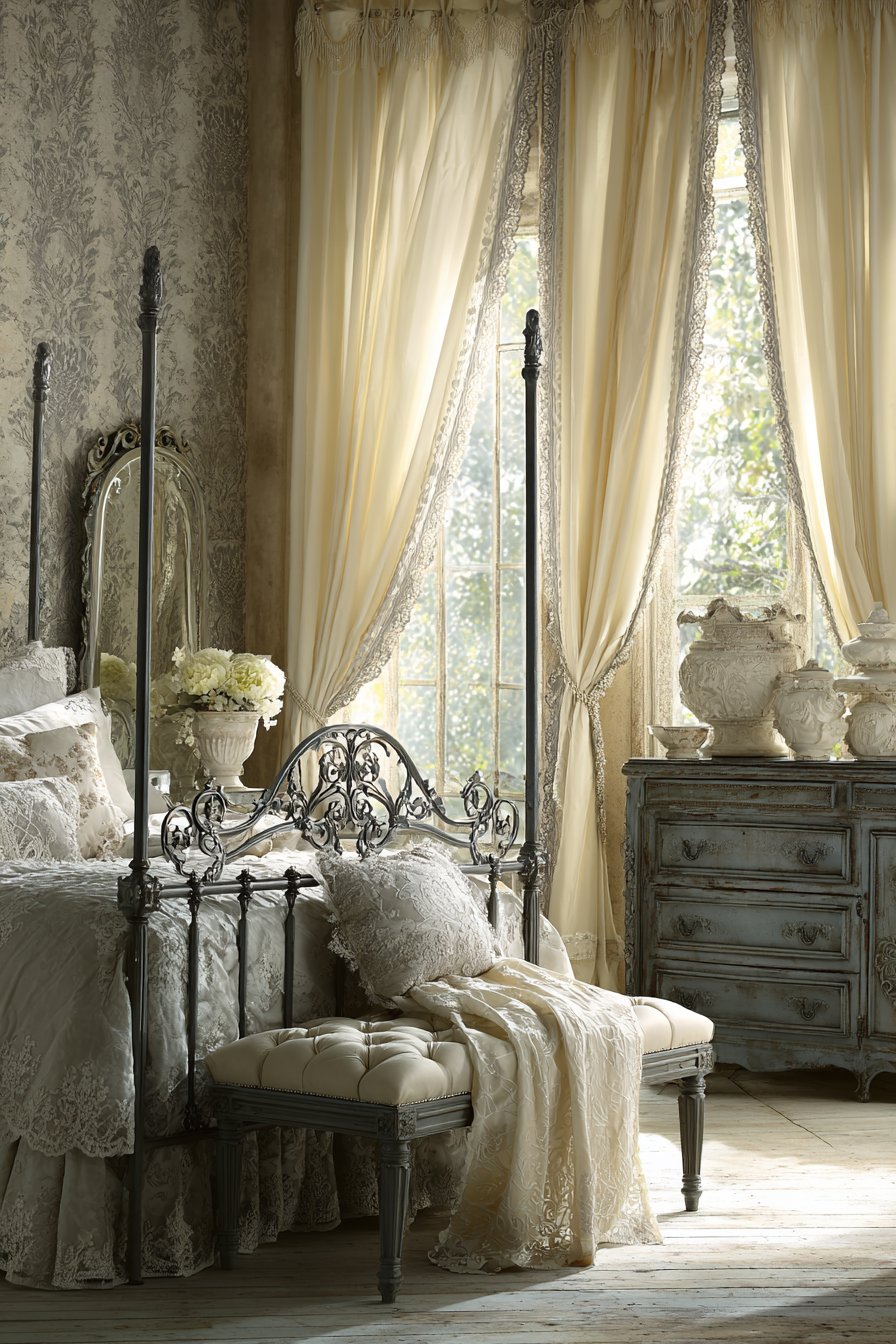 An ornate metal bed frame in antique gray finish brings romantic charm. Scrollwork details add vintage elegance throughout the frame. Cream bedding features vintage-inspired gray embroidered details. This creates timeless sophistication. Layered cream lace curtains filter natural light beautifully. Gray velvet trim adds unexpected richness.