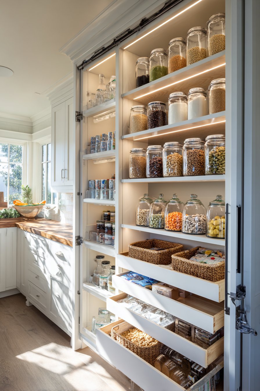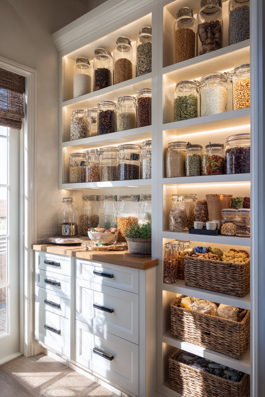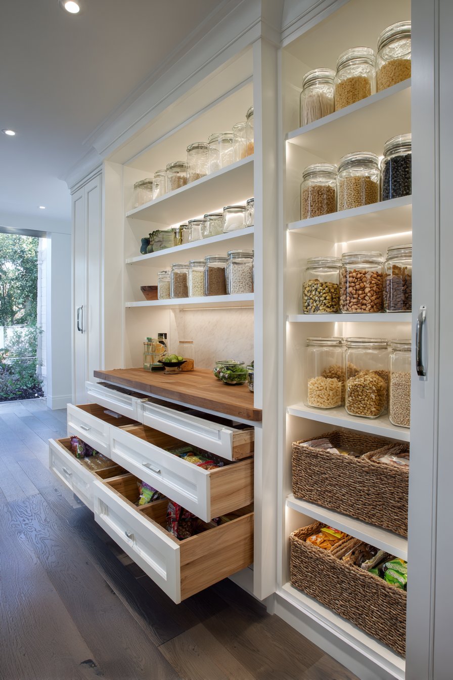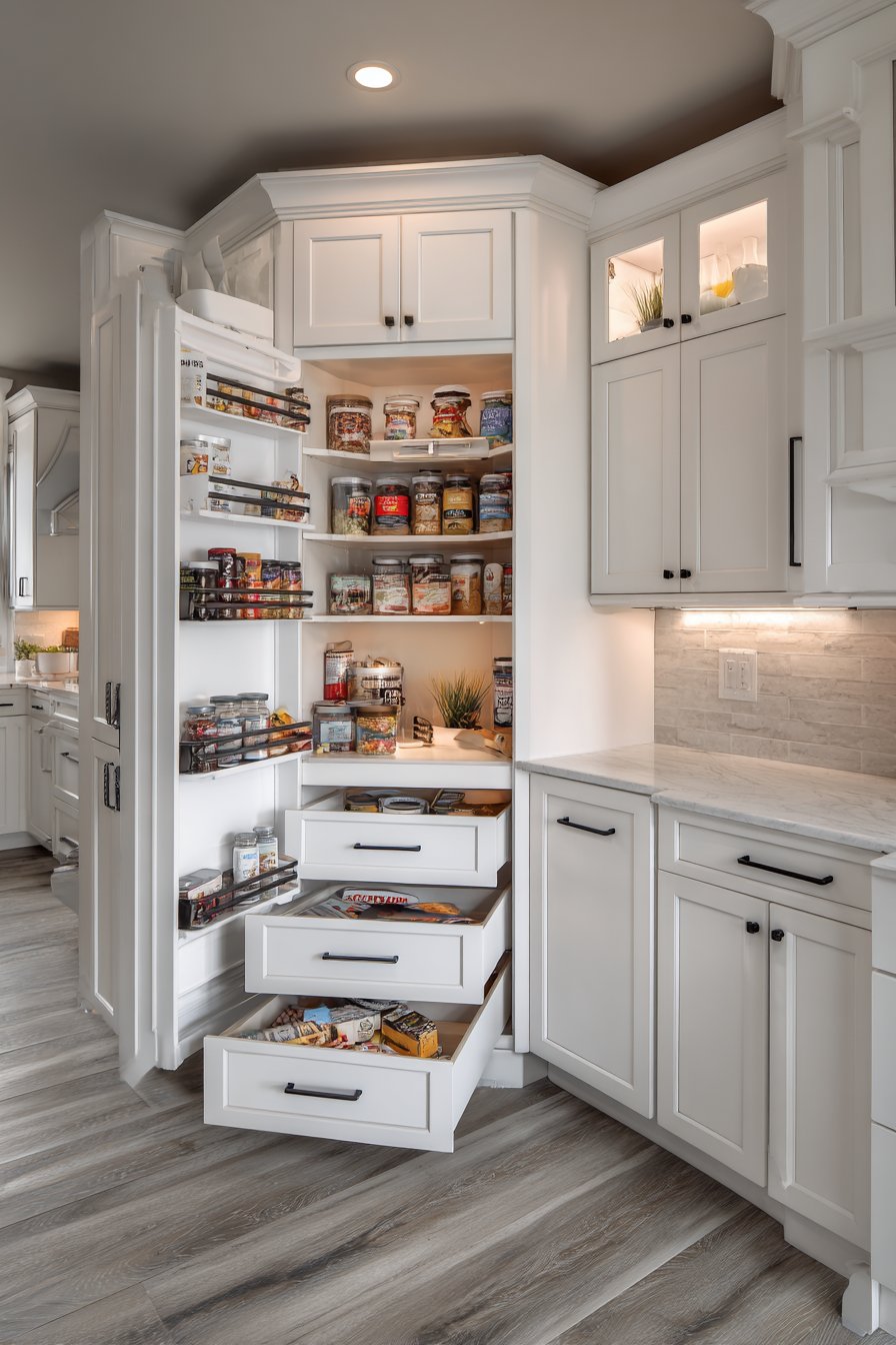 Picture a spacious walk-in pantry with floor-to-ceiling white shaker cabinetry creating clean lines. Pull-out drawers glide smoothly to reveal organized contents. Adjustable shelving adapts to changing storage needs throughout the years. Clear glass canisters display colorful pasta, grains, and beans at eye level.