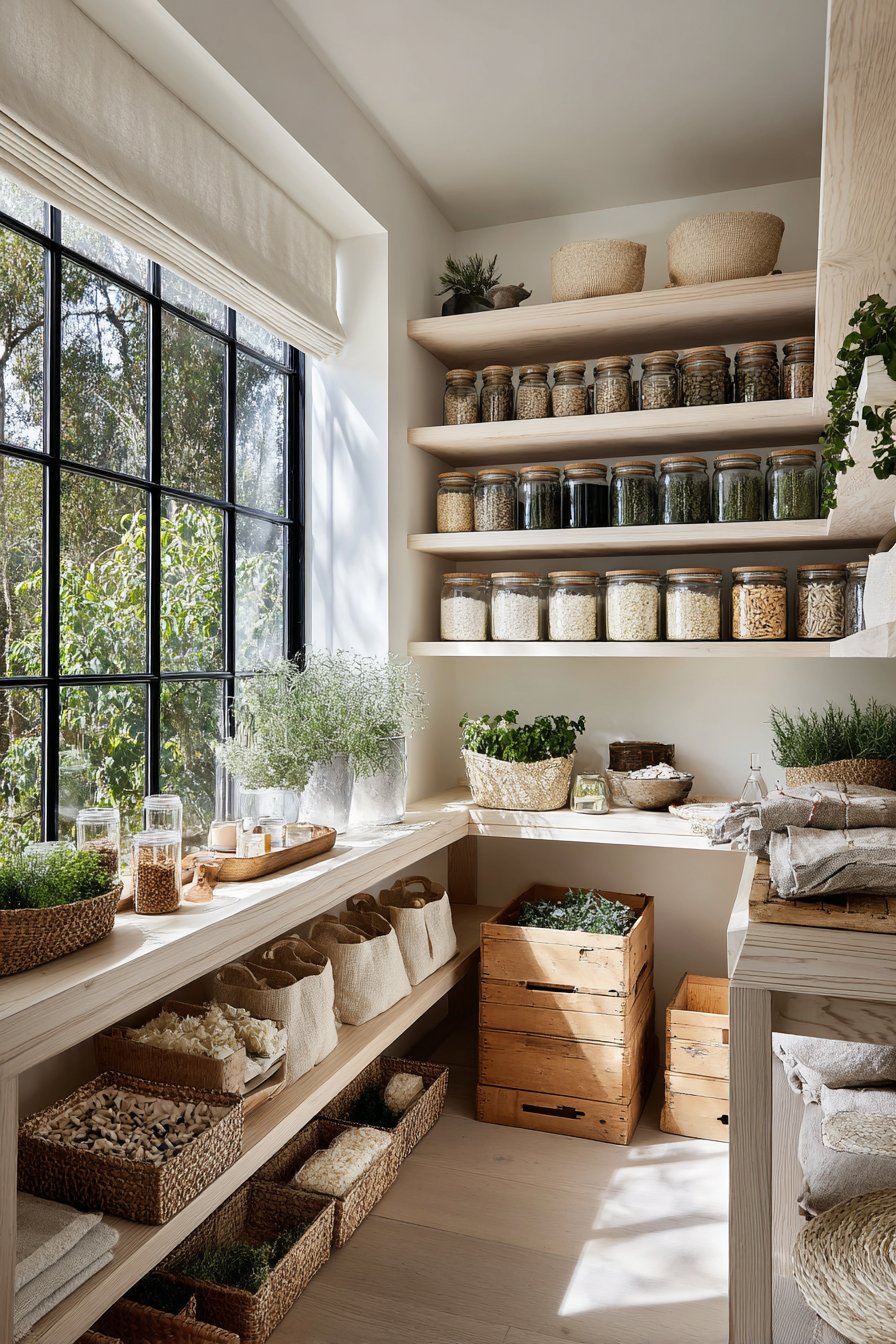Simple wooden crates stack for flexible storage that adapts to changing needs. Small potted herbs on upper shelves add living elements to the space. A large window with simple white roller shade floods the pantry with Nordic light. This abundance of natural illumination defines the Scandinavian aesthetic.