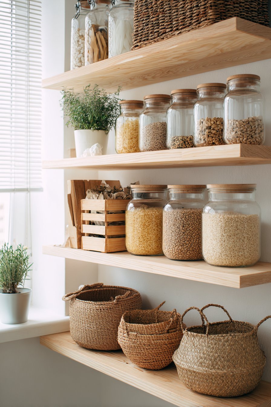 Light birch wood shelving and white painted walls create airy Scandinavian atmosphere. The minimal approach celebrates natural materials and functional beauty. Matching glass jars with cork lids organize dry goods with understated elegance. Woven seagrass baskets provide textural contrast while organizing fresh produce.