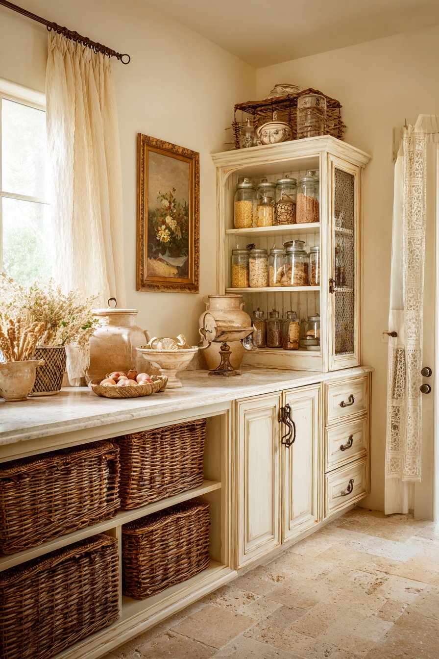 Wire baskets store fresh produce, allowing proper air circulation. Vintage metal bins hold bulk items like flour and sugar. A rolling ladder provides access to upper storage areas. This traditional element adds both function and visual interest to the space.