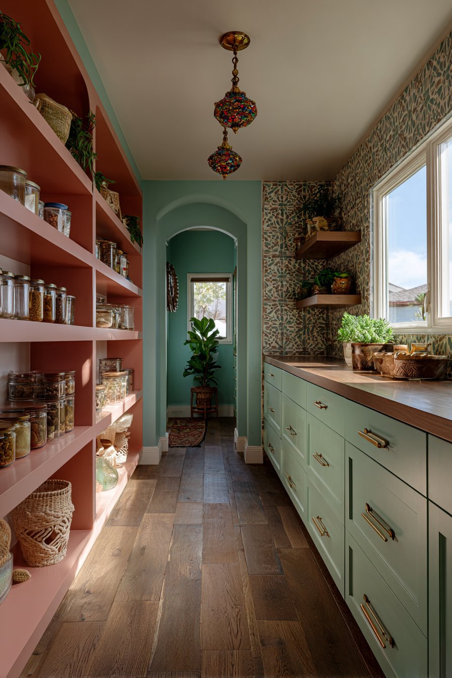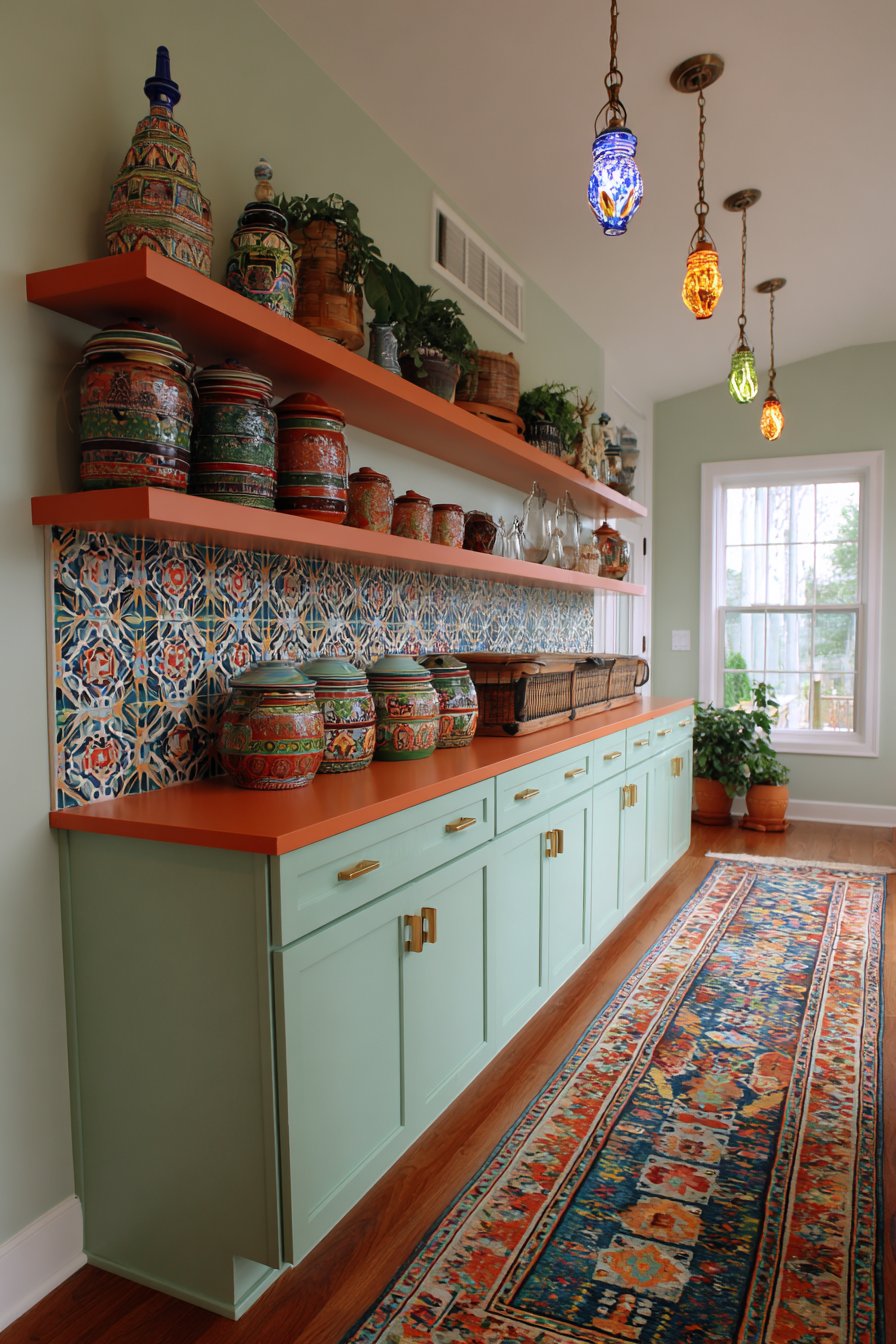 Mint green painted lower cabinets create vibrant foundation in this eclectic pantry. Patterned tile backsplash features Moroccan-inspired geometric designs bursting with color. Open coral-painted shelving displays a mix of vintage and modern containers. The bold color combinations create joyful, personality-filled space.