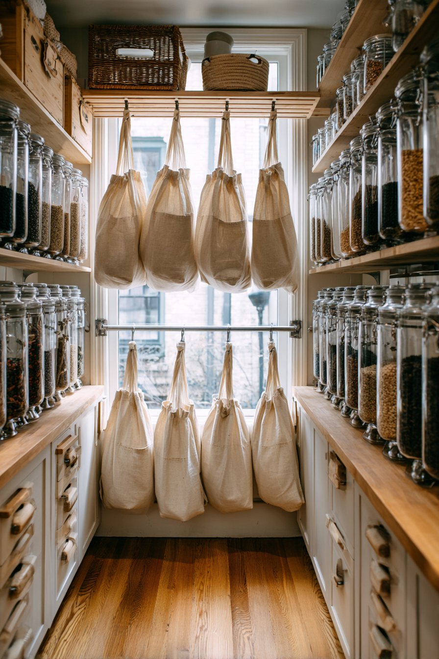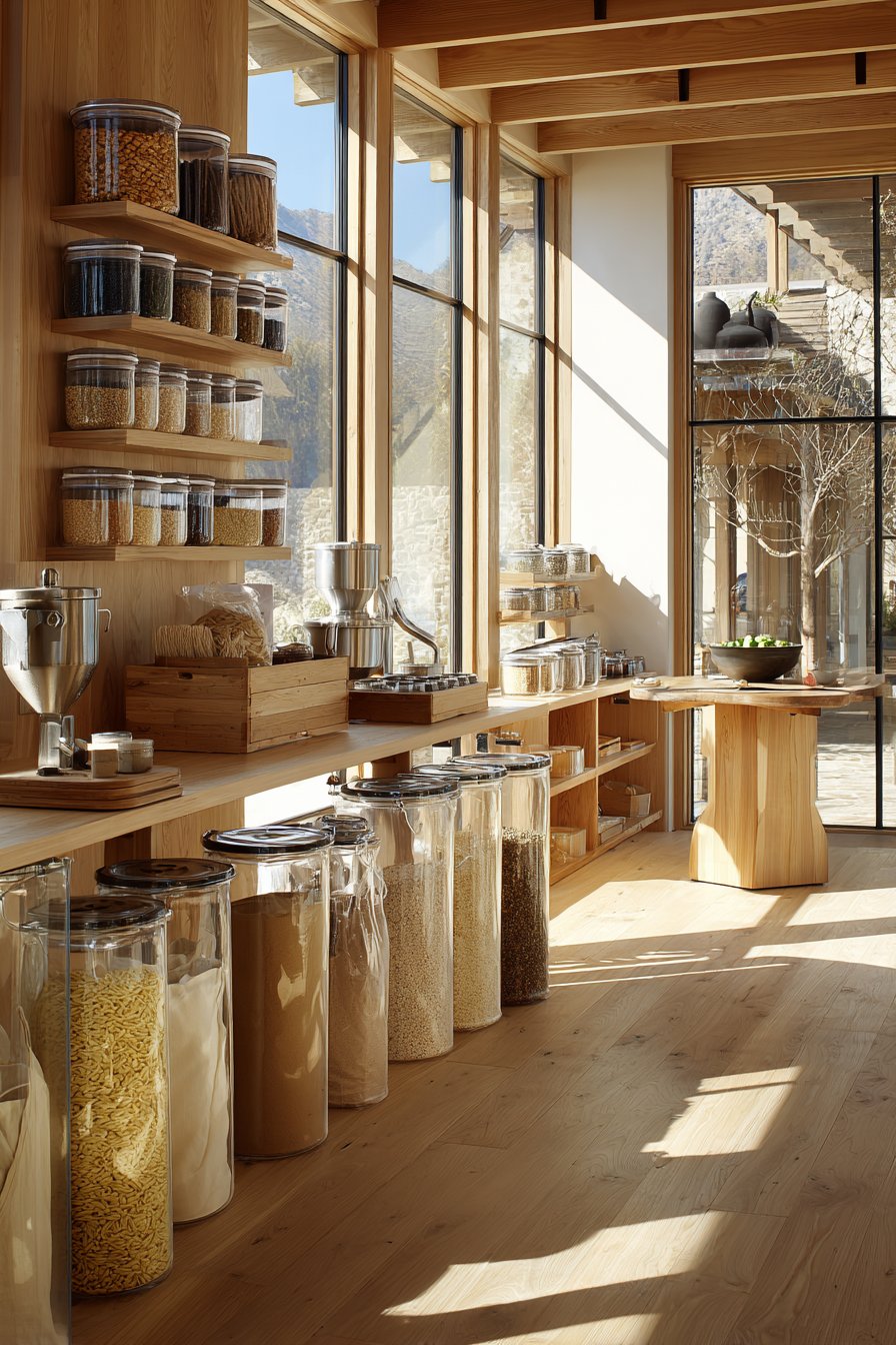 Floor-to-ceiling glass dispensers for grains, beans, and pasta emphasize sustainability. Stainless steel spouts allow easy portion control without packaging waste. Reusable cloth produce bags hang on hooks ready for shopping trips. Wooden crate systems for root vegetables allow proper air circulation.
