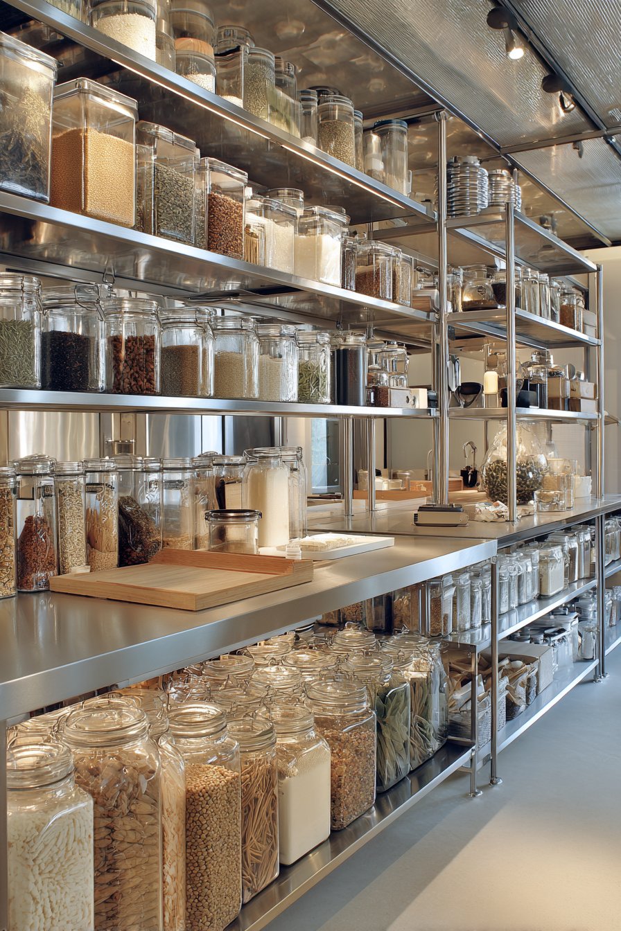 Built-in scales and measurement stations streamline cooking preparation. Inventory management systems visible on tablet mounts track supplies digitally. Stainless steel commercial-style shelving units provide restaurant-quality durability. Bright task lighting throughout eliminates shadows during ingredient selection.