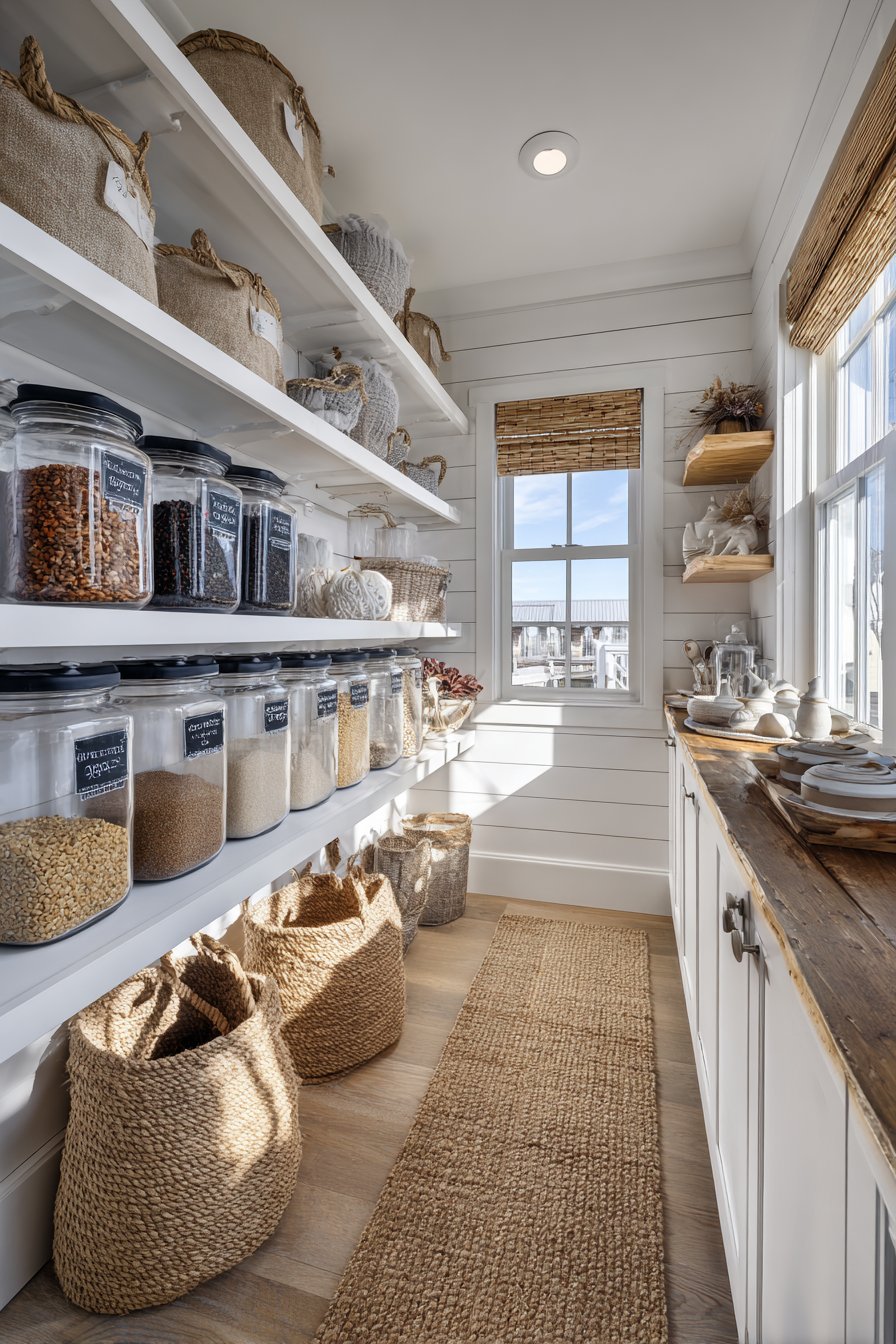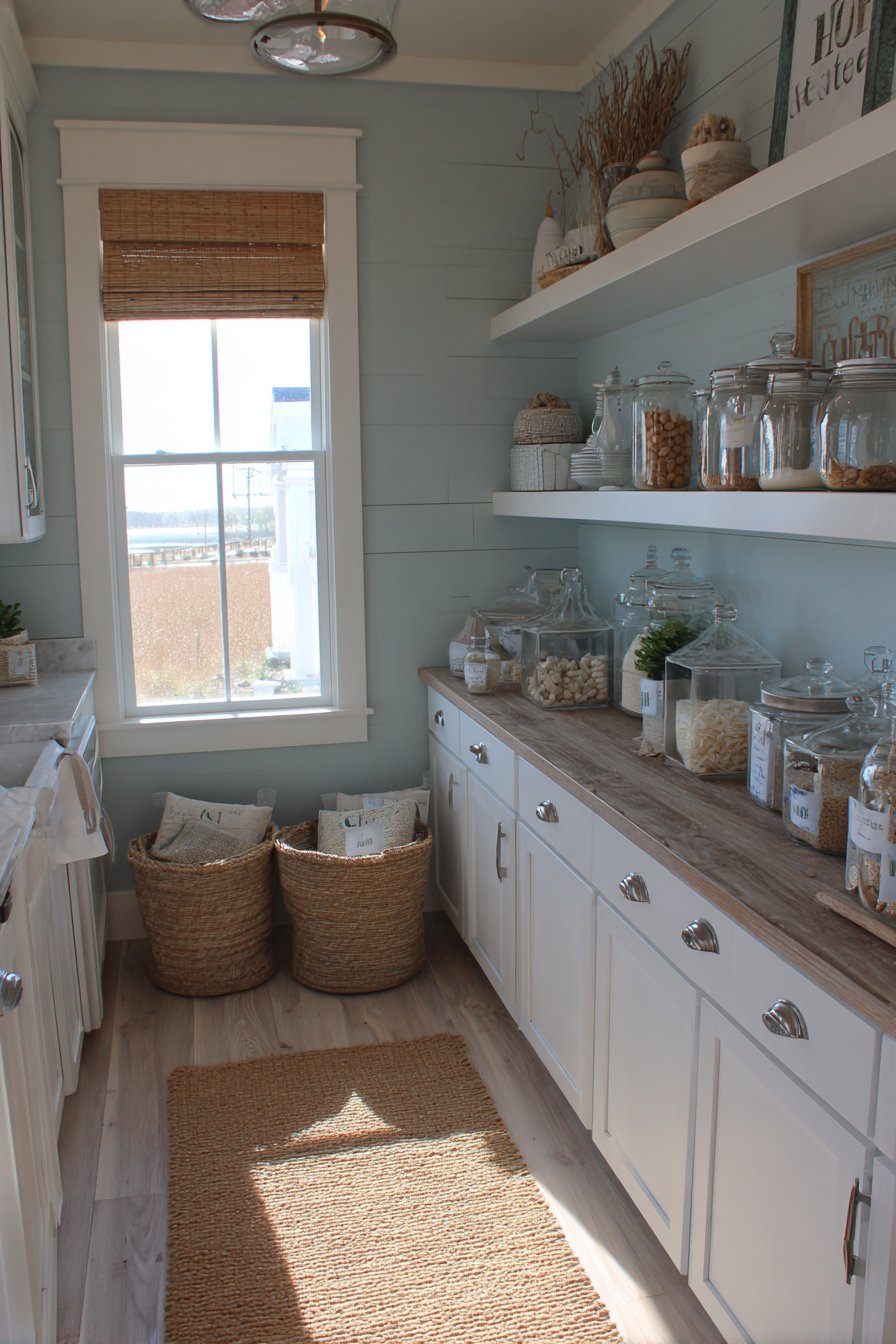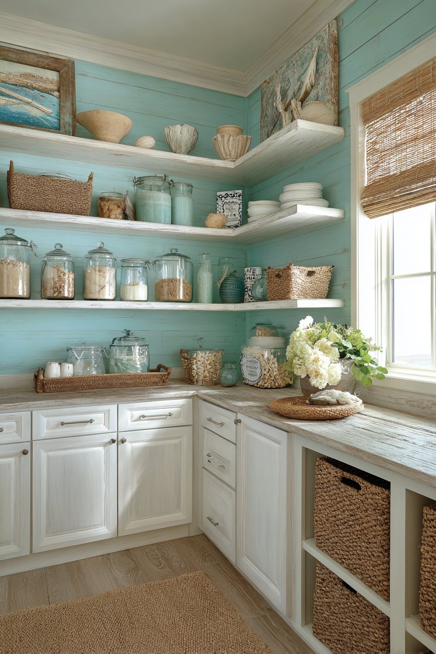 Light aqua-painted shiplap walls evoke ocean breezes in this coastal pantry. White beadboard cabinetry provides classic seaside foundation. Rope-handled baskets and natural fiber containers add authentic beach house detail. Glass jars with nautical-themed labels organize dry goods with coastal charm.