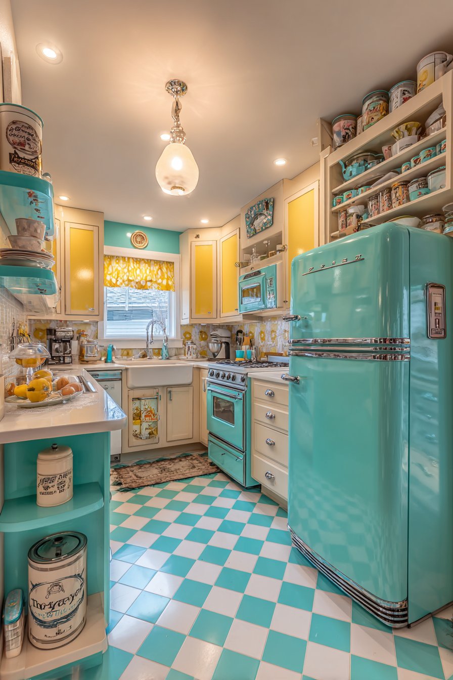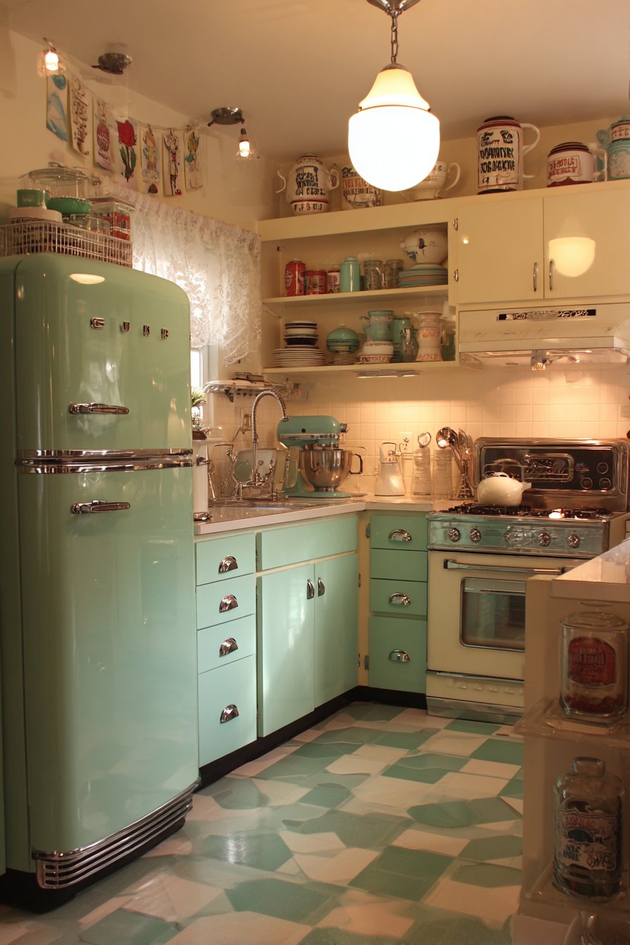 Black and white checkerboard floor tile provides a classic mid-century foundation. Vintage-style refrigerator offers additional cold storage with authentic appearance. Retro pendant light with milk glass shade bathes the space in warm glow. The nostalgic charm transports you to another era.