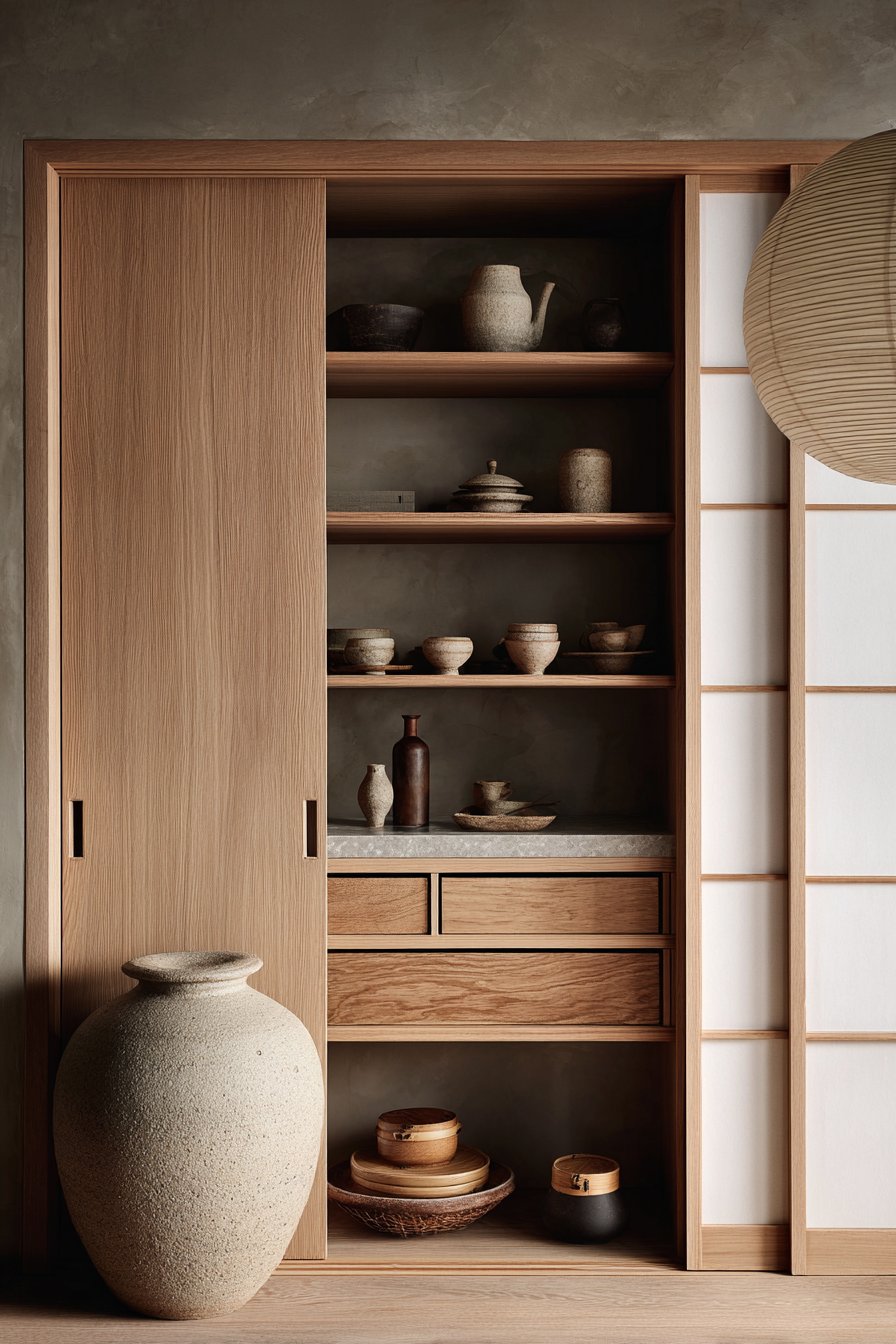 Professional photography with natural zenlike lighting emphasizes serene atmosphere throughout. Wide-angle perspective captures harmonious balance and refined simplicity. Japanese design philosophy applied to pantry organization creates a contemplative space. Every element receives careful consideration in the thoughtful composition.