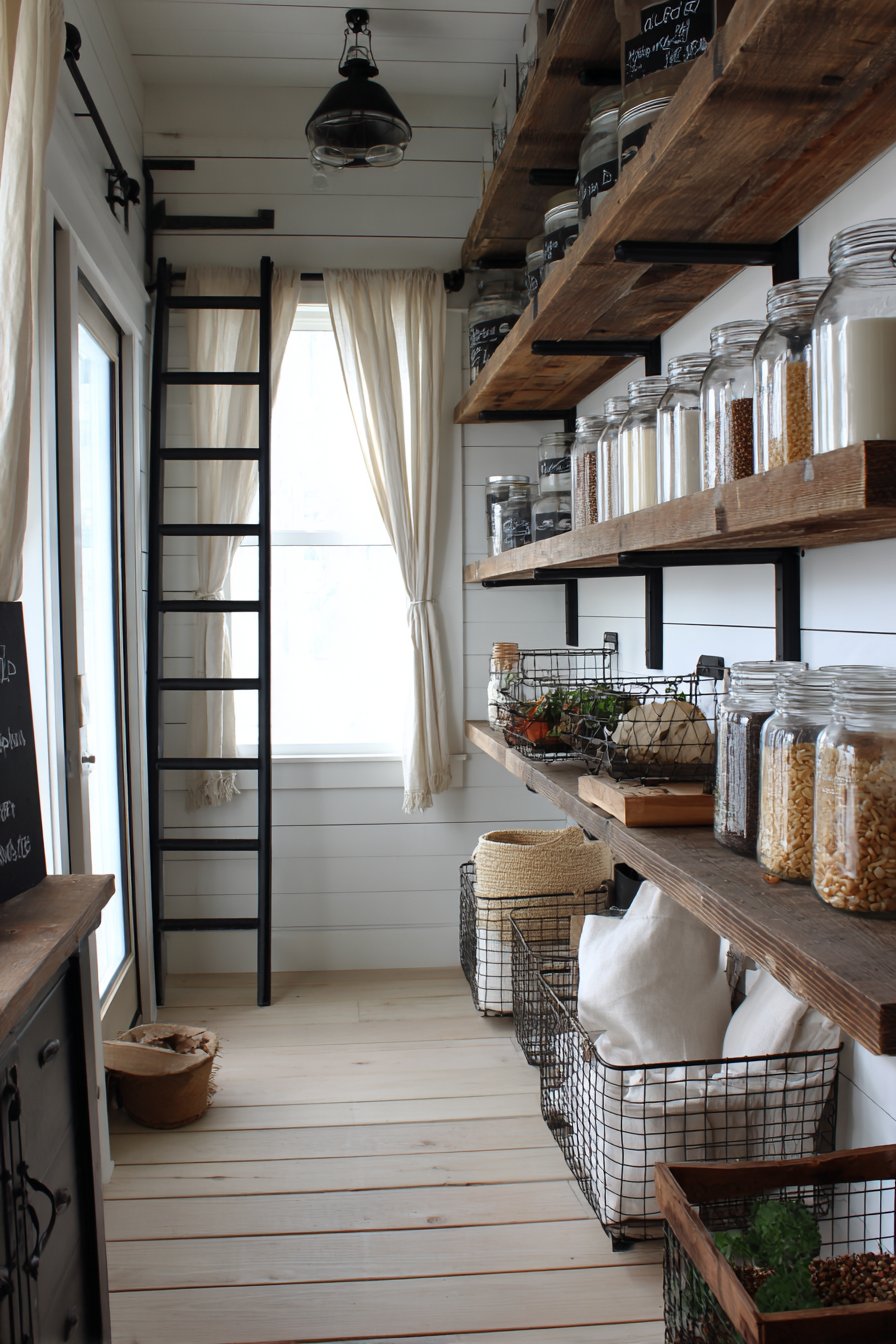A charming farmhouse pantry features reclaimed wood floating shelves against shiplap walls. The warm white paint creates a bright, airy foundation. Mason jars with handwritten chalkboard labels organize baking supplies and spices. This personalized labeling system adds authentic character while maintaining organization.