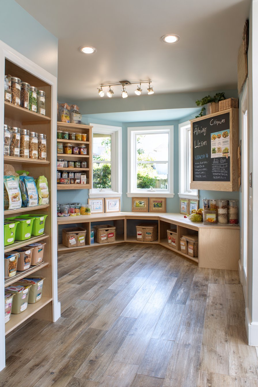 Interior design photography captures practical family organization with cheerful natural lighting. The space accommodates multiple users and purposes while maintaining order. Children and adults both find the pantry accessible and functional. Thoughtful planning creates harmony in busy family life.
