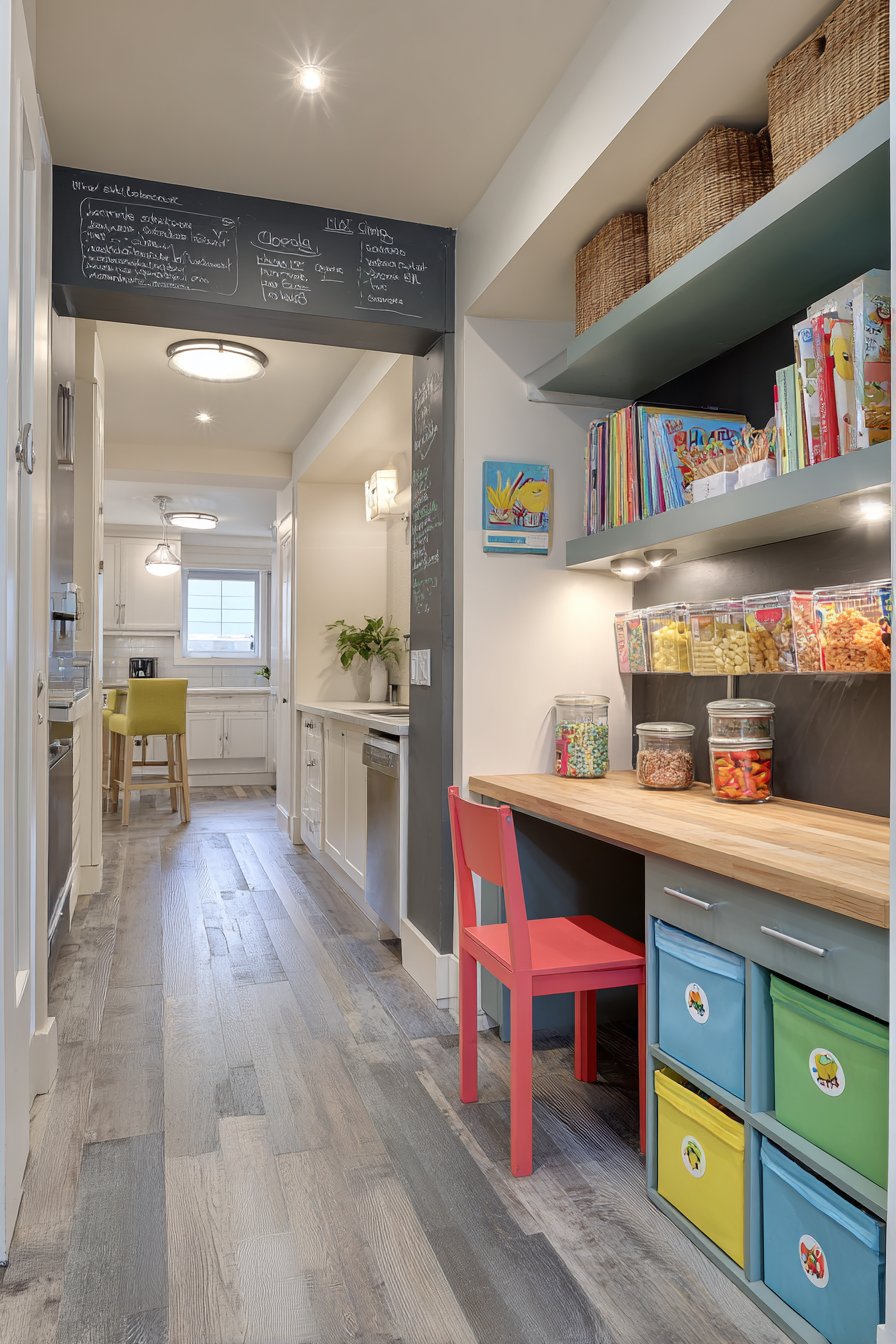 Colorful bins labeled with pictures and words occupy kid-accessible lower storage. The visual organization system helps children learn independence. Snack stations at child height offer healthy options in clear containers. Chalkboard paint sections allow grocery lists and meal planning collaboration.