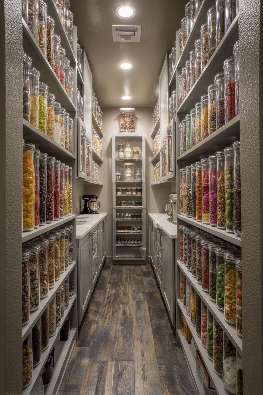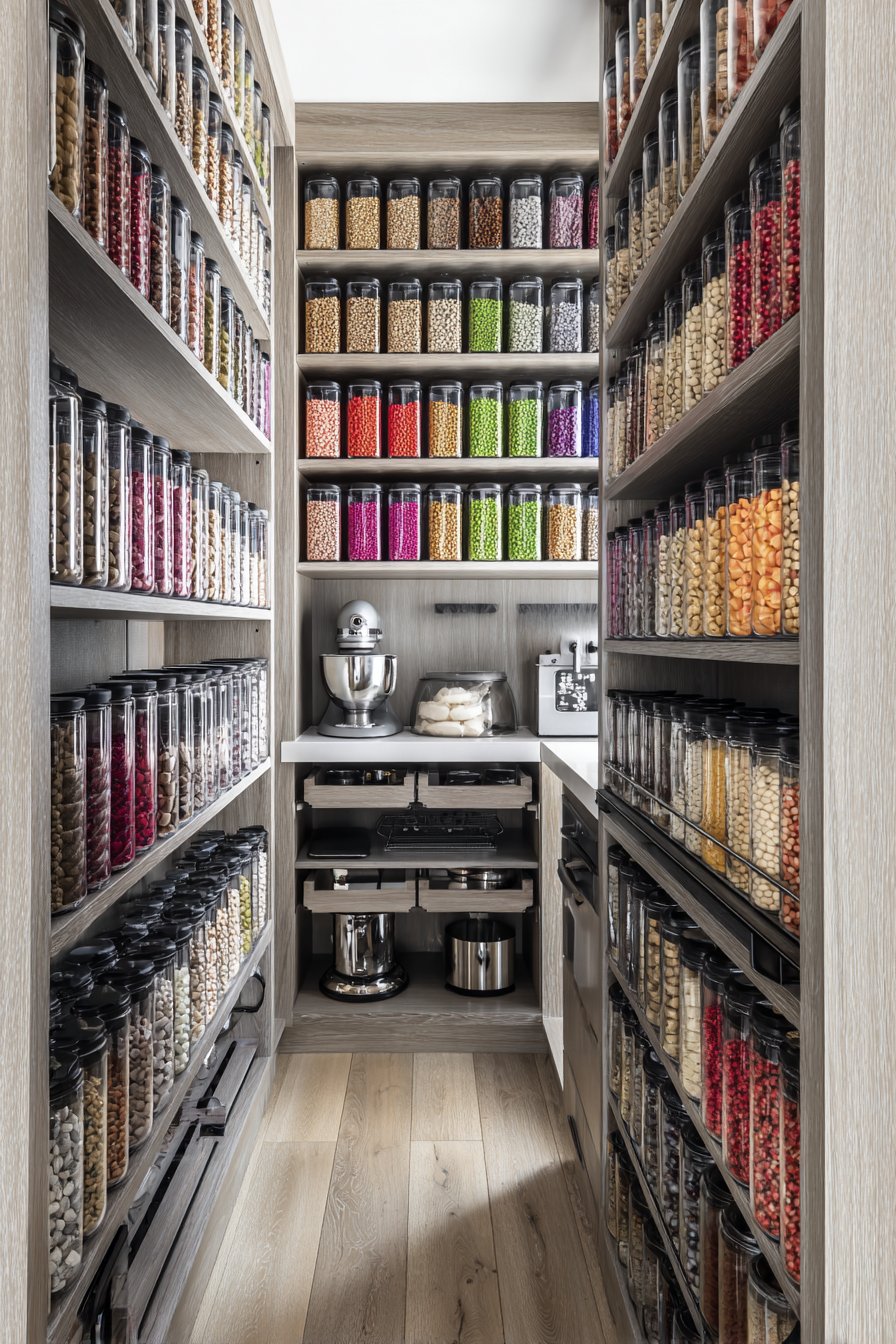 Maximize every inch in a compact walk-in pantry with custom floor-to-ceiling shelving. Light grey painted wood creates visual continuity without overwhelming the small space. Uniform clear acrylic containers with airtight lids display colorful ingredients beautifully. This consistency creates visual cohesion that makes the space feel larger.