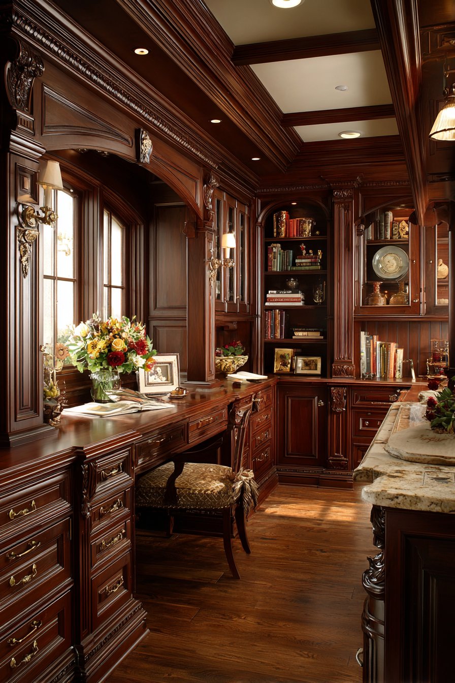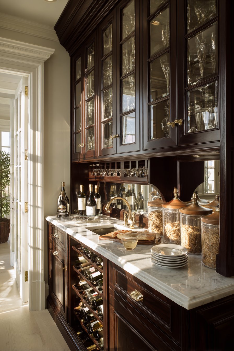 Enter a luxurious pantry with custom dark walnut cabinetry exuding refined elegance. Soft-close drawers operate silently and smoothly. Glass-front upper cabinets display fine china and glassware collections. The marble countertop workspace includes an undermount prep sink with polished brass faucet.
