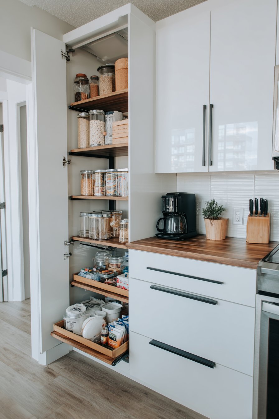 Detail-focused photography reveals how clever organization transforms limited square footage. Soft lighting emphasizes practical efficiency and space-saving innovations. The design demonstrates that apartment dwellers can achieve beautiful pantry organization. Small spaces require creativity but deliver impressive results.