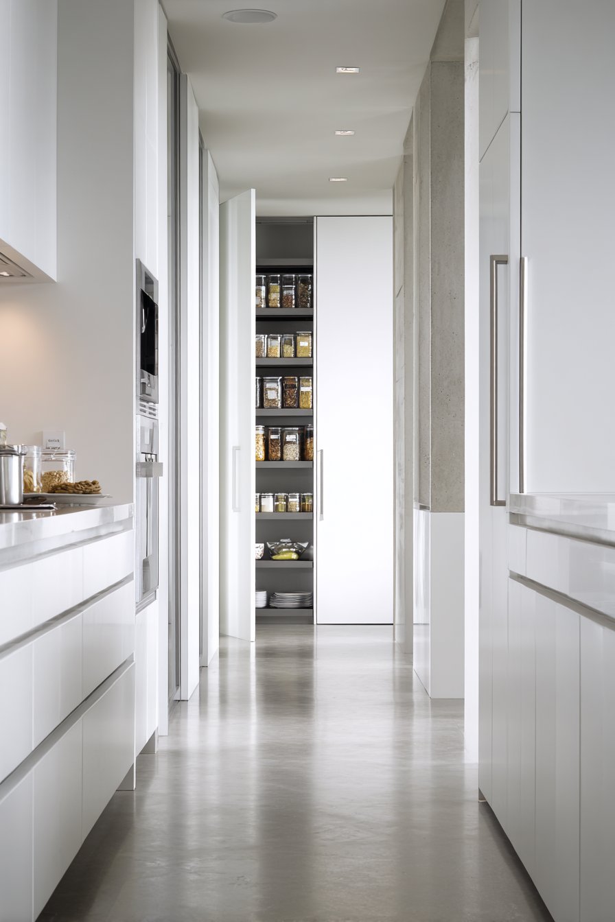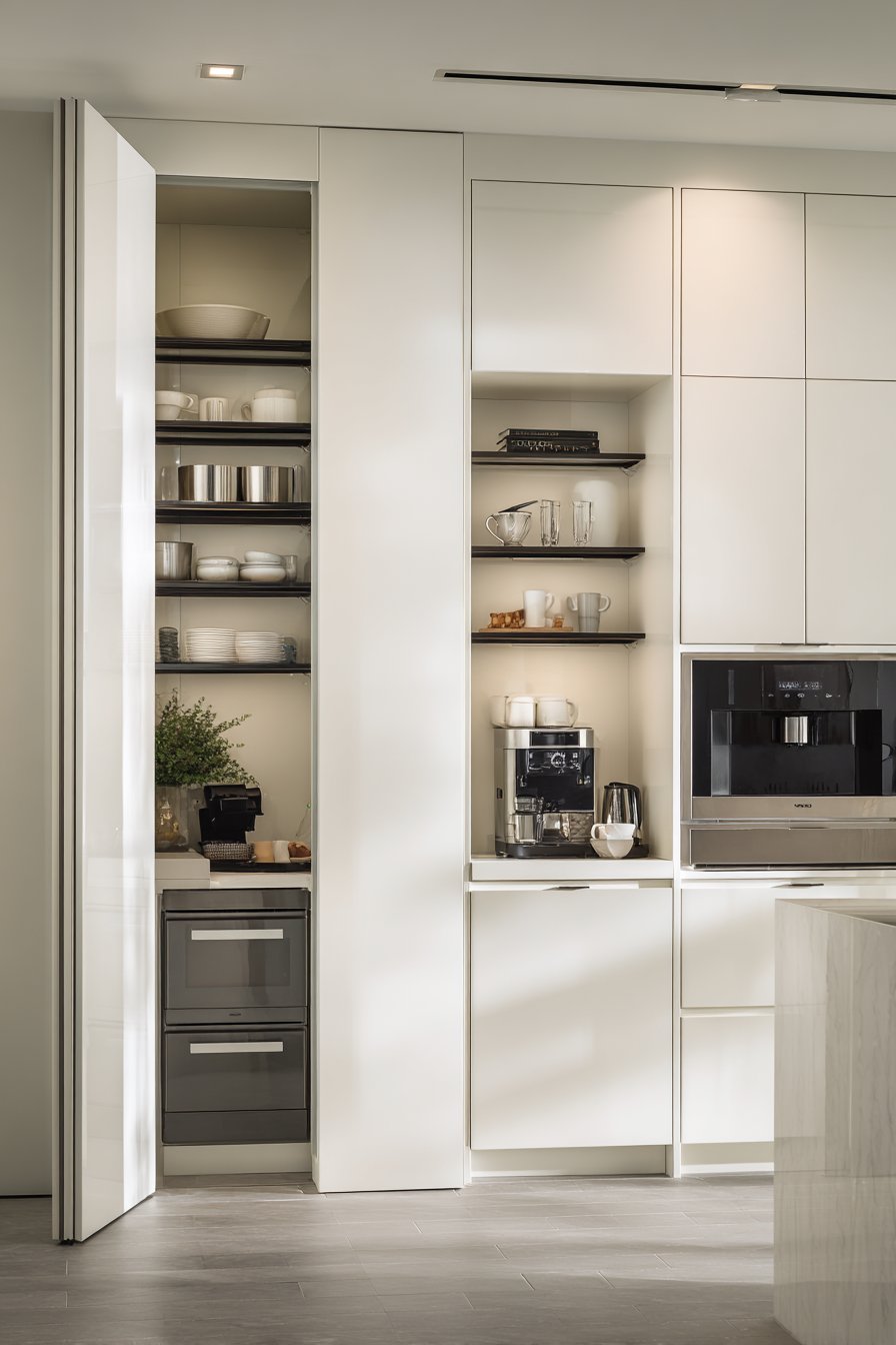 A modern minimalist pantry features handleless white lacquer cabinets creating seamless surfaces. The clean lines eliminate visual clutter entirely. Open shelving in matte black metal displays carefully curated storage containers. Monochromatic organization creates zen-like calm and intentional simplicity.
