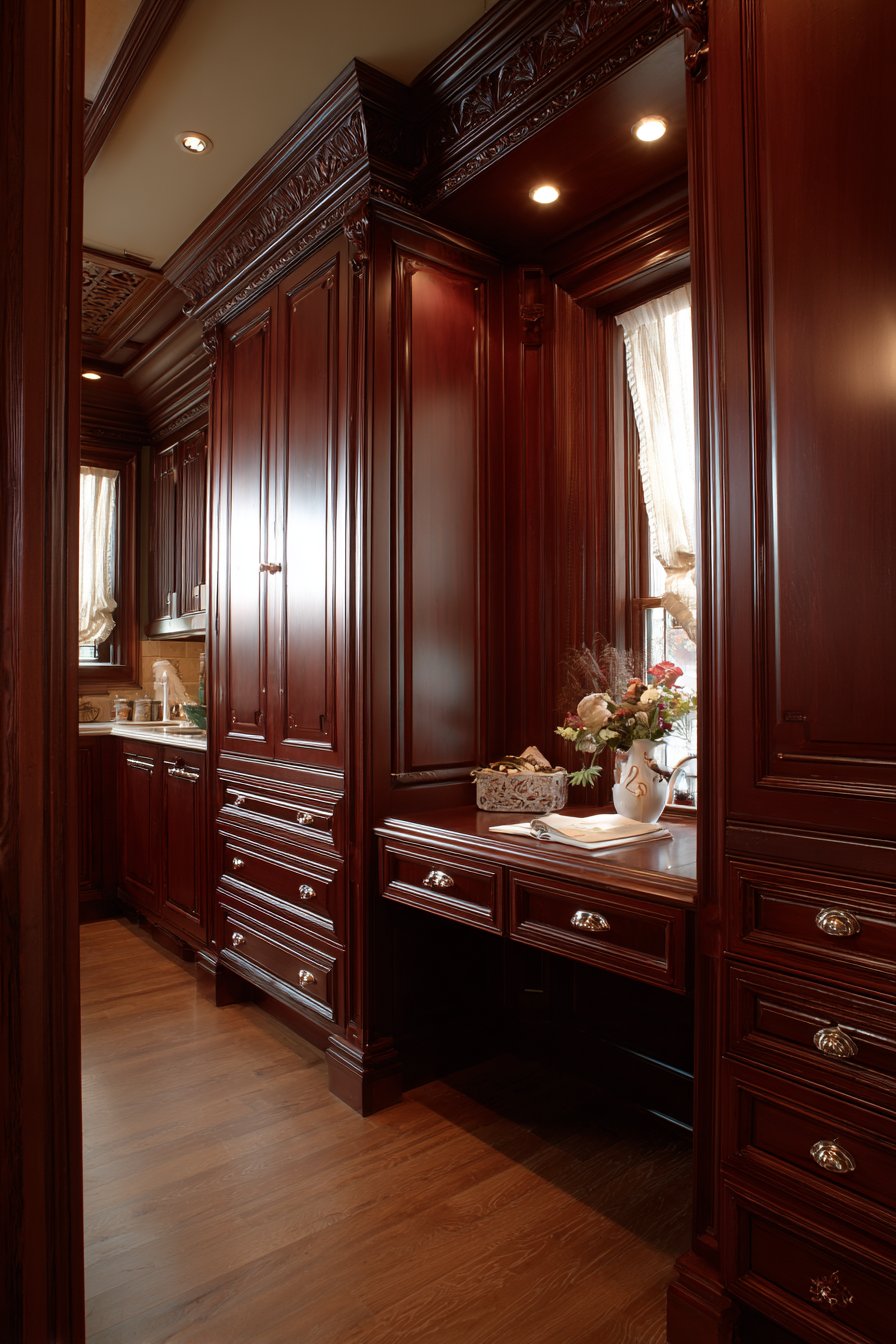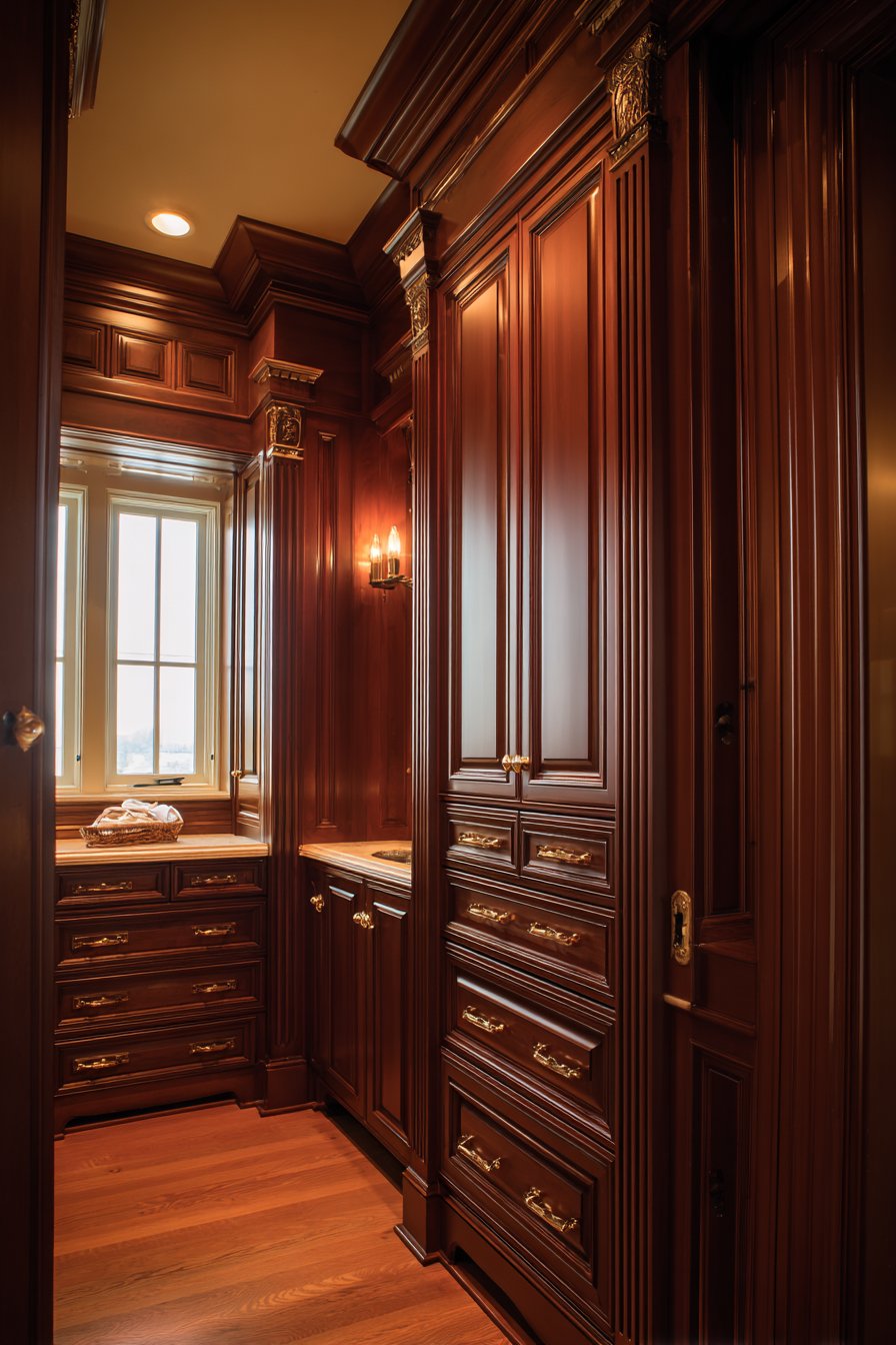 Rich cherry wood built-in cabinetry defines this traditional pantry design. Raised panel doors showcase quality craftsmanship and attention to detail. Antique brass hardware adds warmth and classic elegance. Multiple drawer depths accommodate various storage needs from flatware to table linens.