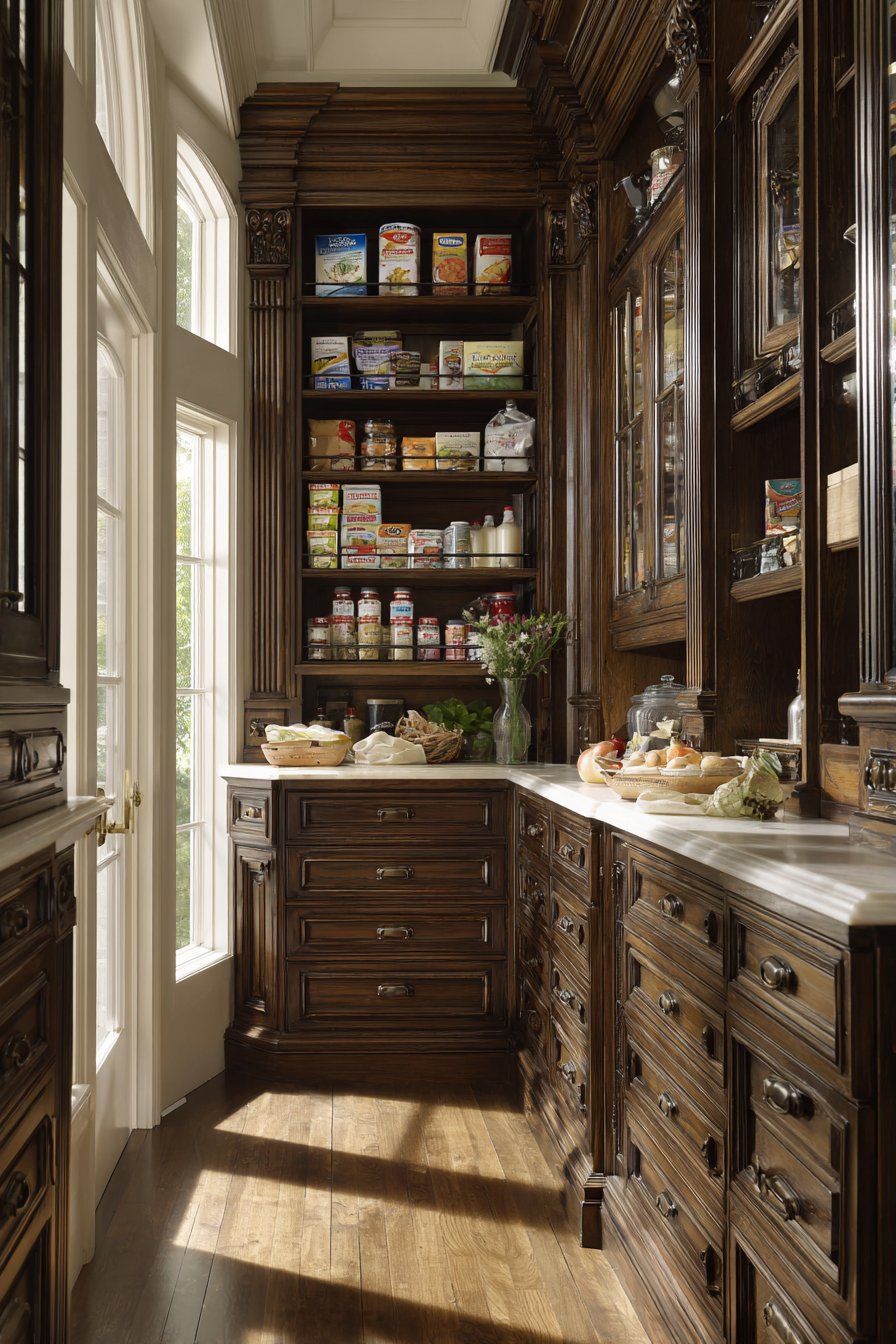 A built-in desk area organizes recipes and meal planning materials. Small drawers keep cooking notes, shopping lists, and favorite recipes accessible. Crown molding and decorative corbels add architectural interest to the space. These traditional details elevate the pantry beyond mere storage.