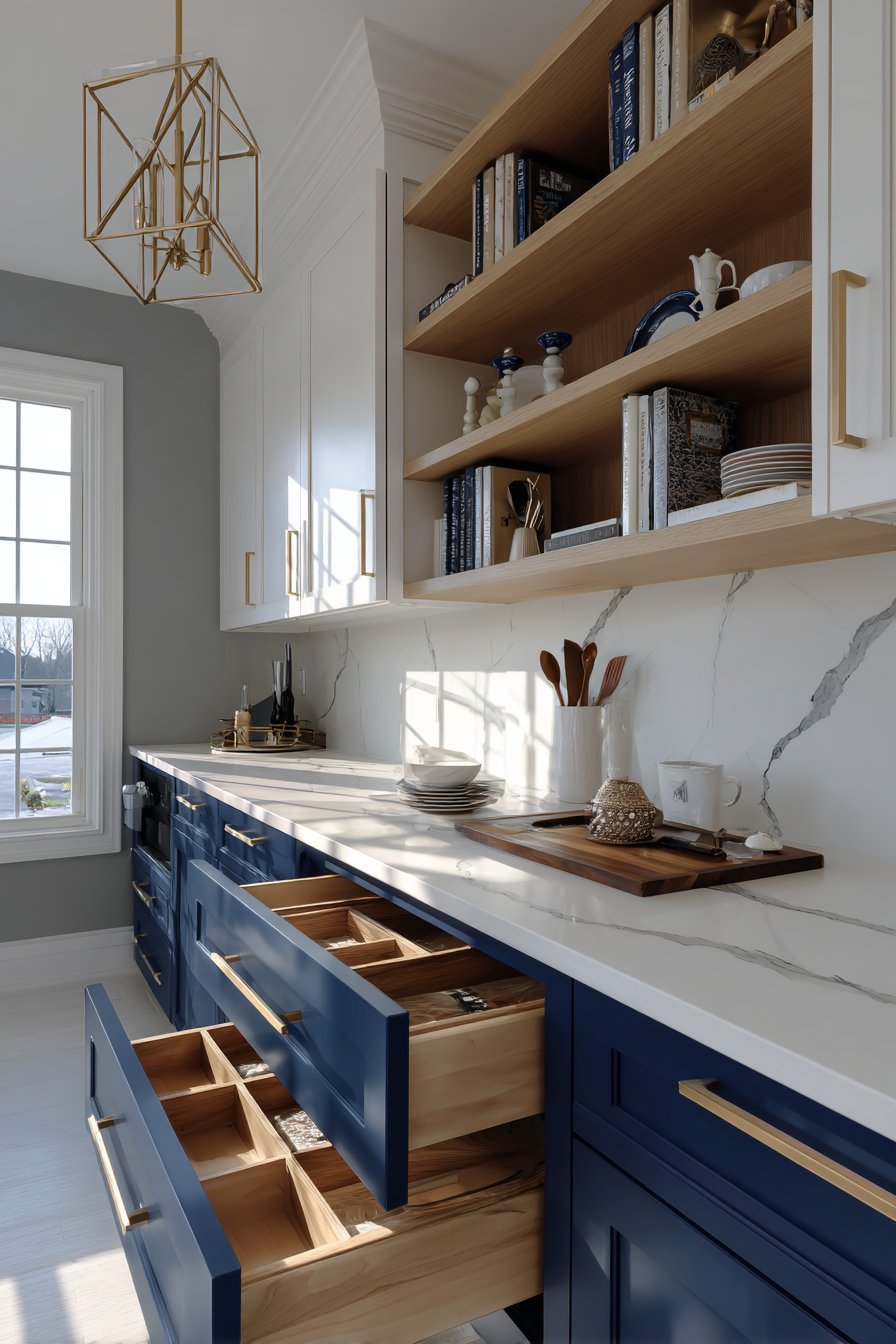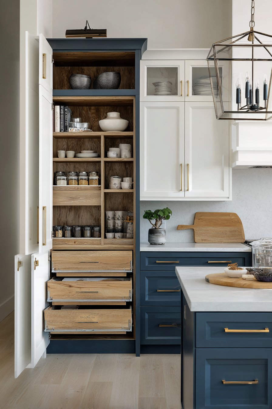 Contemporary style shines in this two-tone pantry design. Navy blue lower cabinets ground the space with sophisticated color. White upper cabinets create visual lift and brightness. Gold hardware adds warmth throughout, connecting the color scheme beautifully.