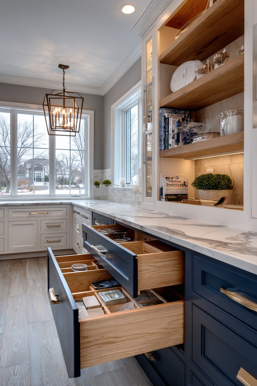 An open middle section displays cookbooks and decorative serving pieces. Natural oak shelving provides warmth between the painted surfaces. Drawer organizers visible in partially opened drawers demonstrate systematic utensil storage. This transparency showcases the thoughtful organization within.