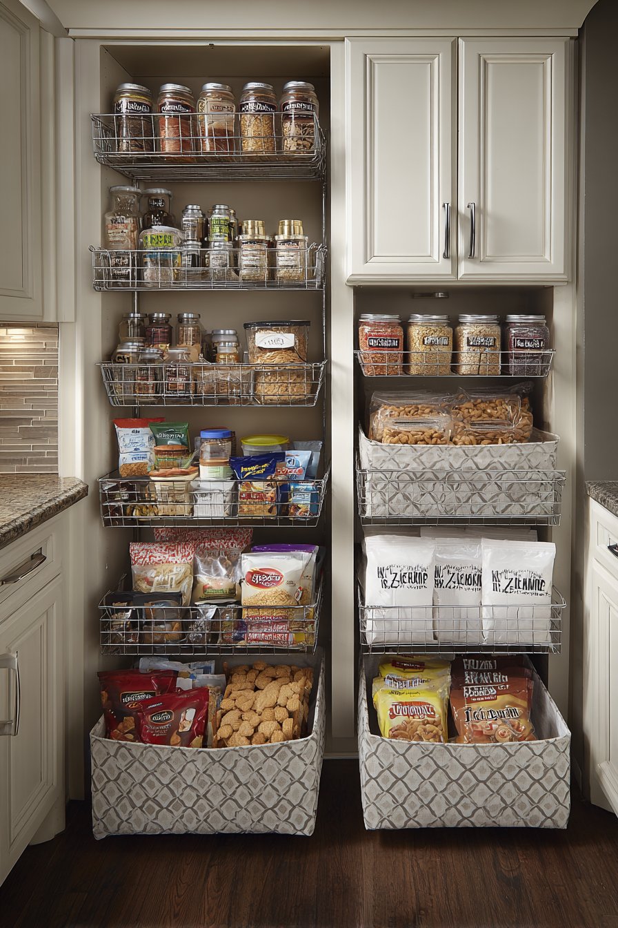 The organizational systems featured address real-world storage challenges effectively. Pull-out drawers, lazy Susans, and adjustable shelving adapt to changing household needs. Clear containers, labeled bins, and dedicated zones create intuitive storage that family members navigate easily. These practical solutions eliminate kitchen frustration.
