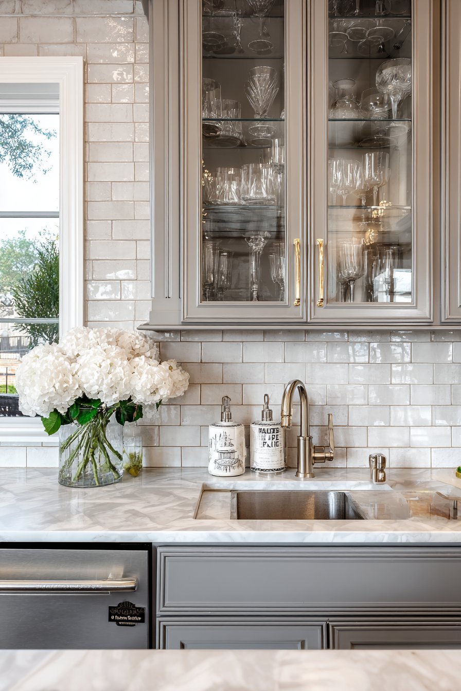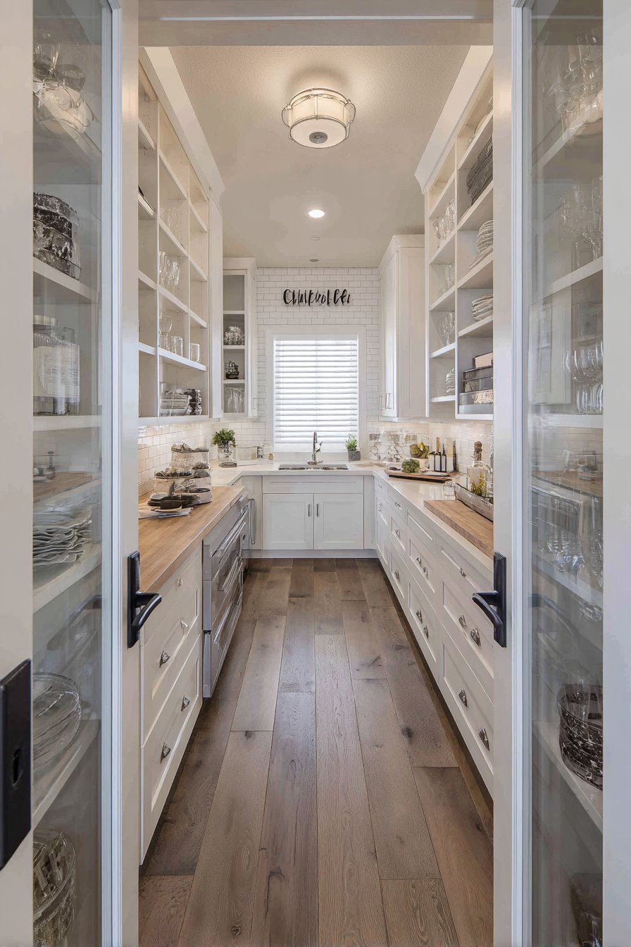 A butler’s pantry style connects kitchen to dining area with sophisticated design. Glass-front upper cabinets display fine dishware and stemware collections. Lower cabinets feature deep drawers storing table linens and serving pieces. The central island with butcher block top provides additional workspace and storage.